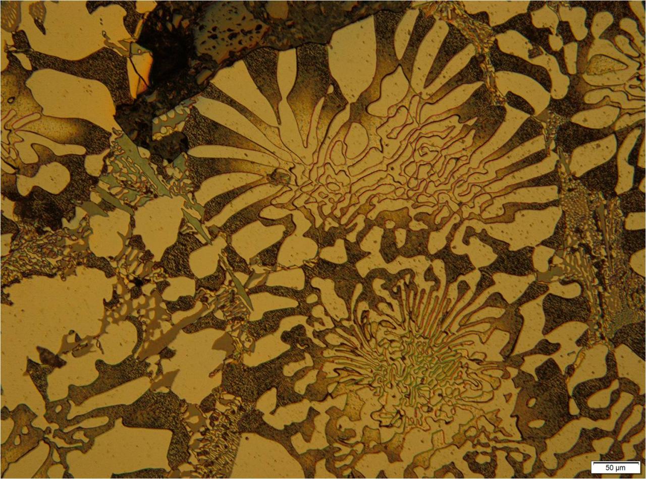 Le diagramme quaternaire Ni-Cr-Si-B est mal connu, et mal modélisé par les bases de données thermodynamiques actuelles. Ces alliages sont des alliages de brasage. On observe ici la présence d’eutectiques binaires : borures de Nickel de type Ni3B / phase f.c.c. du Nickel, sous forme de sphéroïdes. Photos prises au microscope optique, après attaque au réactif de Kallin.