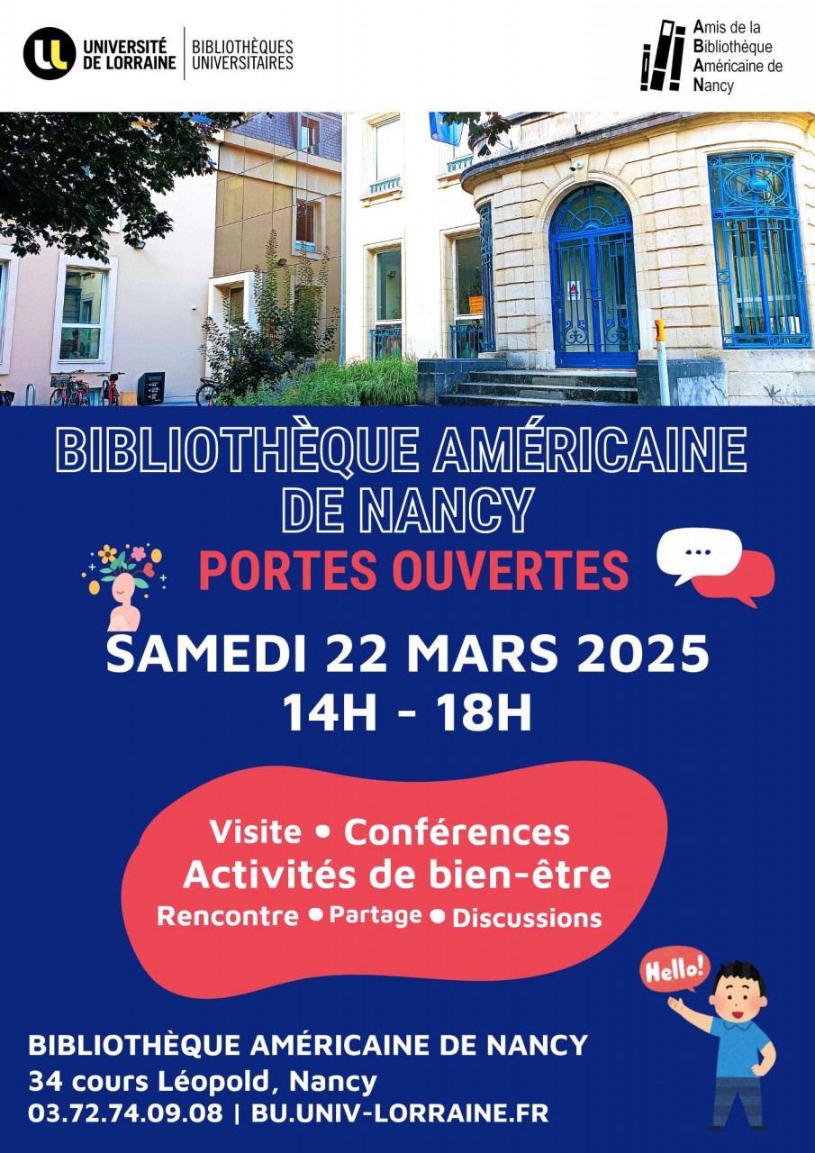La Bibliothèque américaine de Nancy vous propose une journée portes ouvertes le samedi 22 mars 2025 et ouvrira exceptionnellement ses portes de 14h à 18h.