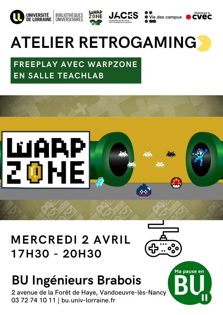 Mercredi 2 avril, la bibliothèque universitaire Ingénieurs Brabois vous propose un atelier « Rétrogaming : freeplay en salle TeachLab », animé par l’association Warp Zone.