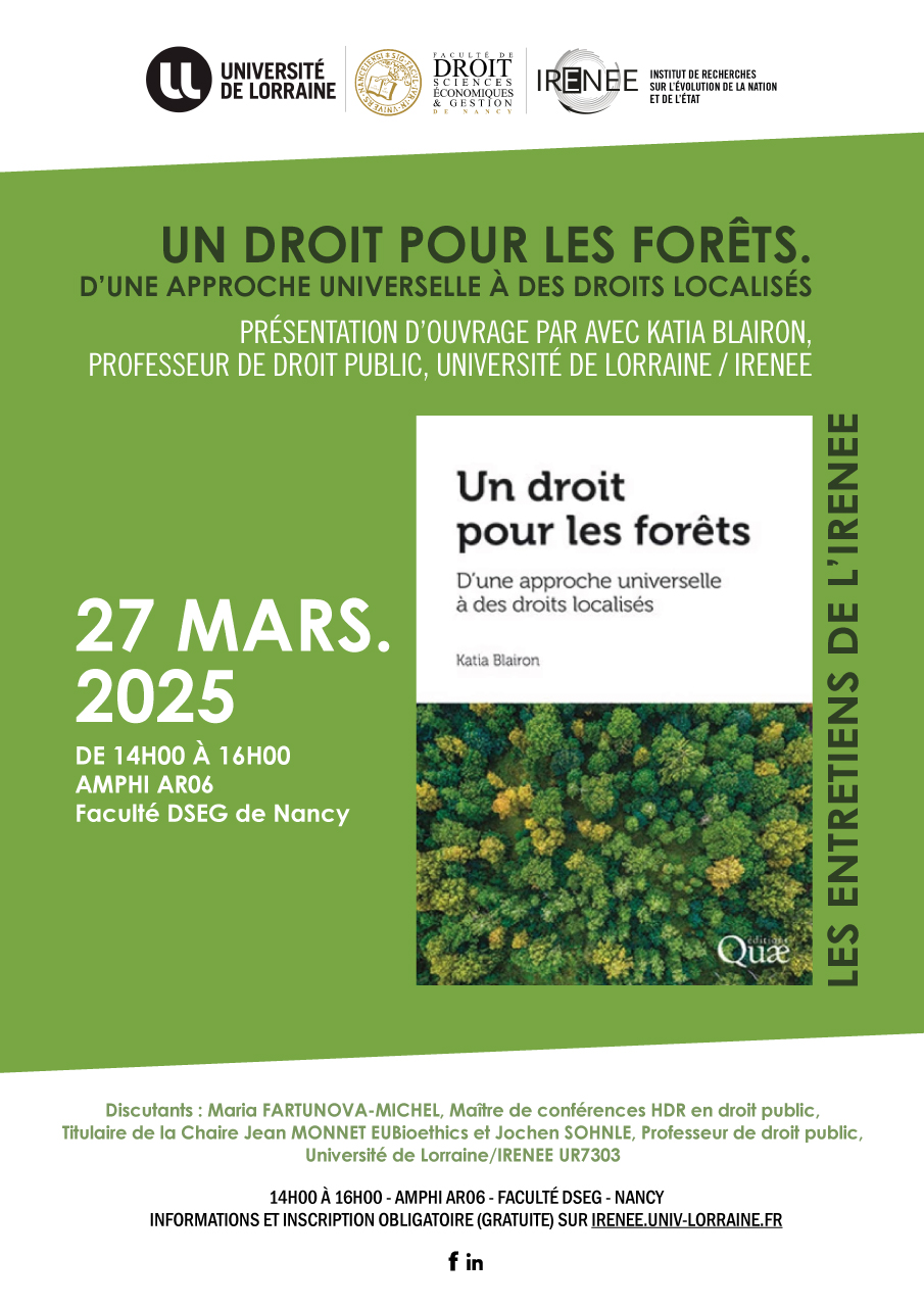 Présentation de l'ouvrage Un droit pour les forêts. D’une approche universelle à des droits localisés (ed. Quae 2023), par Katia BLAIRON, Professeur de droit public, Université de Lorraine/IRENEE. Discutants : Maria FARTUNOVA-MICHEL, Maître de conférences HDR en droit public, Titulaire de la Chaire Jean MONNET EUBioethics et Jochen SOHNLE, Professeur de droit public, Université de Lorraine/IRENEE UR7303.