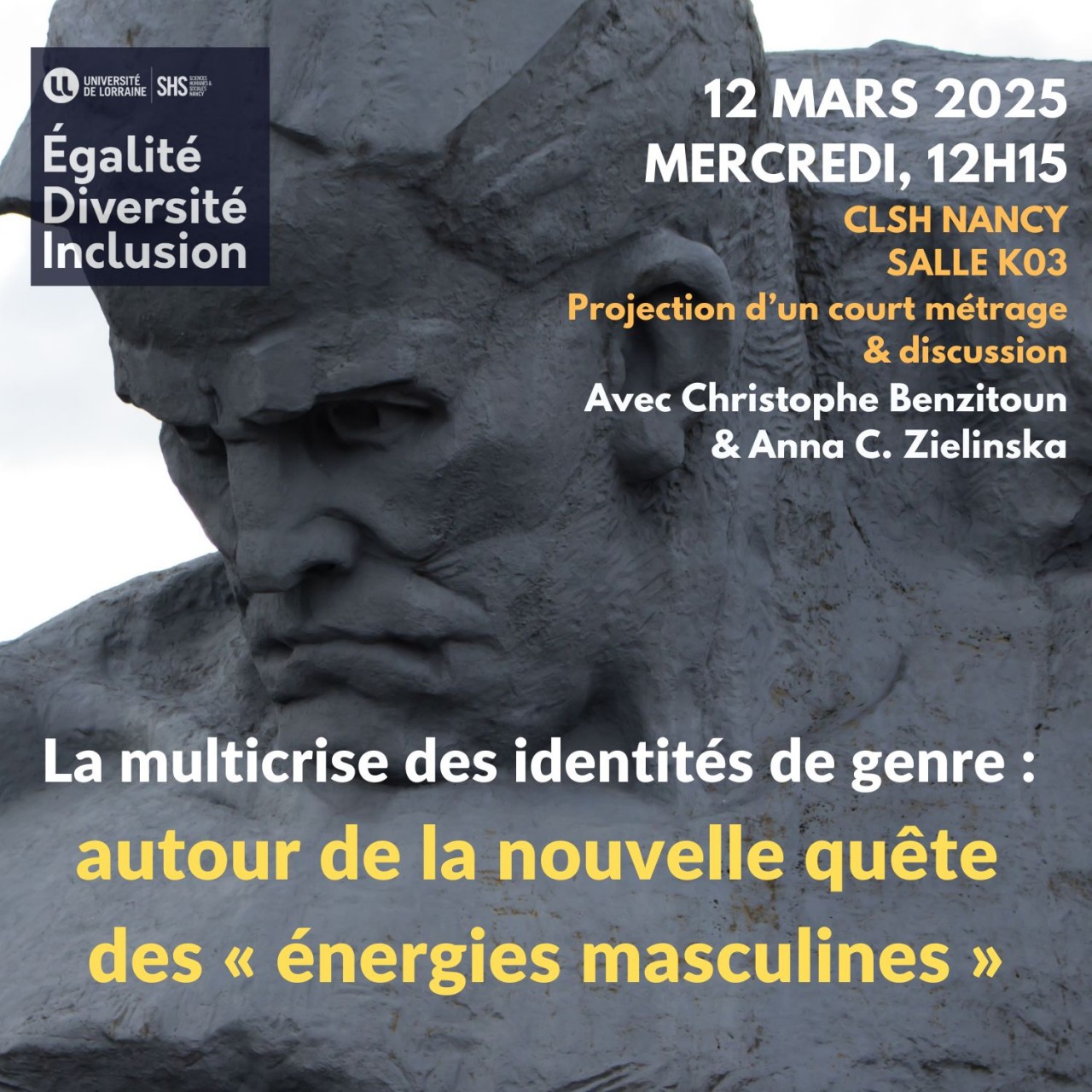 Nous allons commencer par la projection d'un court métrage : Viril : Mâles Party, réalisé par Camille Juza & Matthias Vaysse (2025). Nous ouvrirons ensuite la discussion, qui sera animée par Christophe Benzitoun (Maitre de conférences en linguistique française) et Anna C. Zielinska (Maitresse de conférences en philosophie), membres de la cellule EDI – égalité, diversité, inclusion – de l'UFR SHS à l'Université de Lorraine.