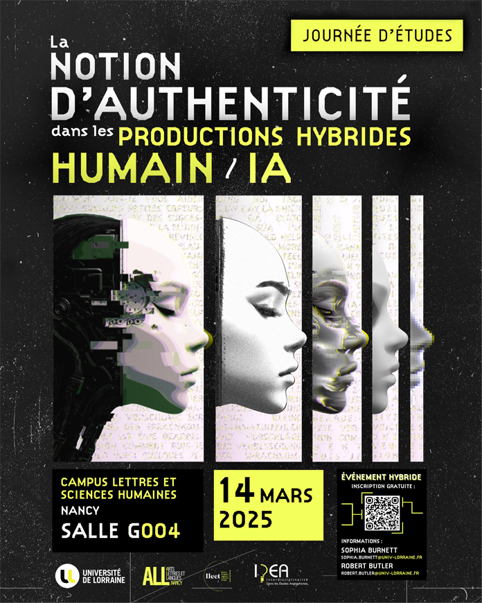 Le 14 mars prochain se tiendra la journée d'études "La notion d’authenticité dans les productions hybrides humain / IA" sur le Campus Lettres et Sciences Humaines à Nancy, salle G004 !