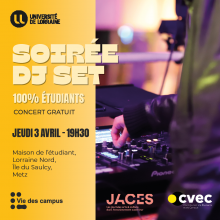 À l’occasion des Journées des Arts et de la Culture de l’Enseignement Supérieur (JACES), l’Université de Lorraine vous invite à une soirée électro inédite, entièrement animée par des DJ étudiants !