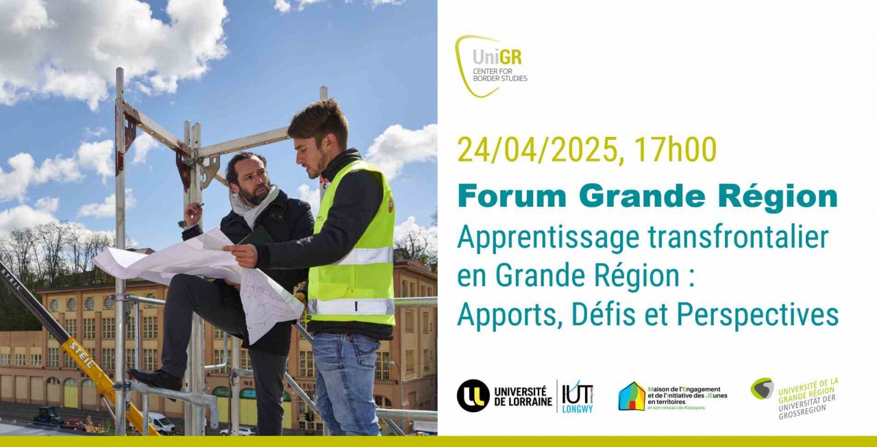 Le Forum Grande Région UniGR-CBS est organisé par la Maison de l’engagement et de l’Initiative des jeunes en Territoires (MEIJE), l’IUT Henri Poincaré de Longwy (Université de Lorraine) et l'UniGR-Center for Border Studies (UniGR-CBS) en coopération avec le groupe de travail de l'UniGR-CBS « Emploi et Education Transfrontaliers ».
