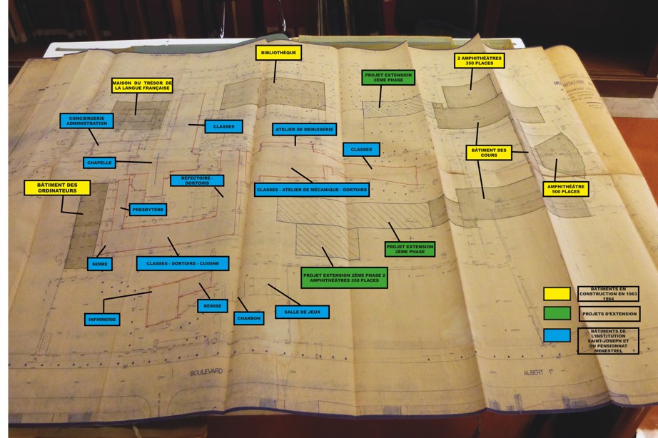 L’enseignement dans les bâtiments de l’Institution St Joseph continue lors des travaux, en effet ils sont restés en service jusqu’à l’inauguration de la faculté en octobre 1964. Les deux frères ANDRÉ ont donc été contraints d’en tenir compte et ont dû se résoudre à construire le bâtiment principal au Nord du terrain, dans la partie la plus inclinée.