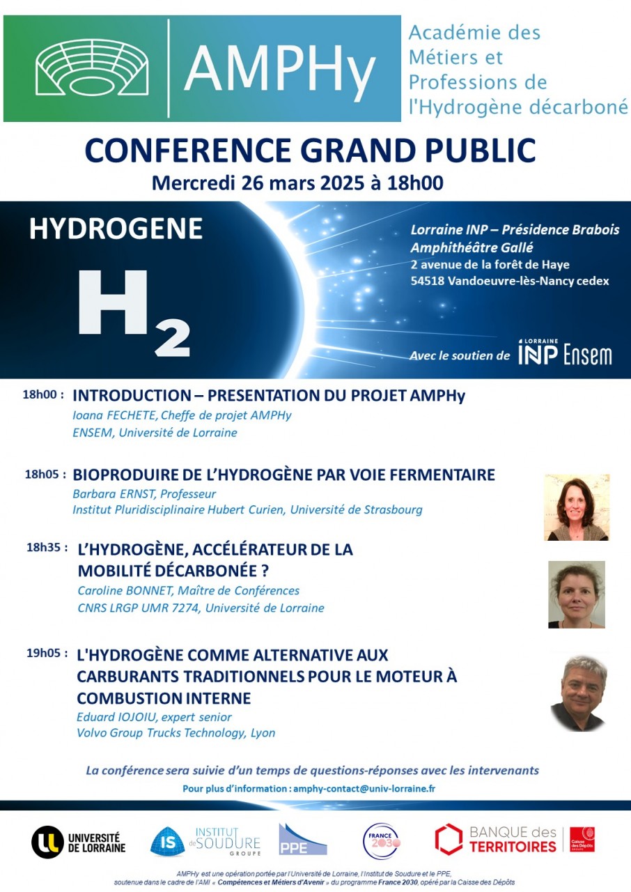 Le projet AMPHy - Académie des Métiers de l’Hydrogène décarboné (AMI-CMA, France 2030) à l'immense plaisir de vous convier à la quatrième conférence grand public sur l'hydrogène. La conférence se tiendra le 26 mars -18h à :