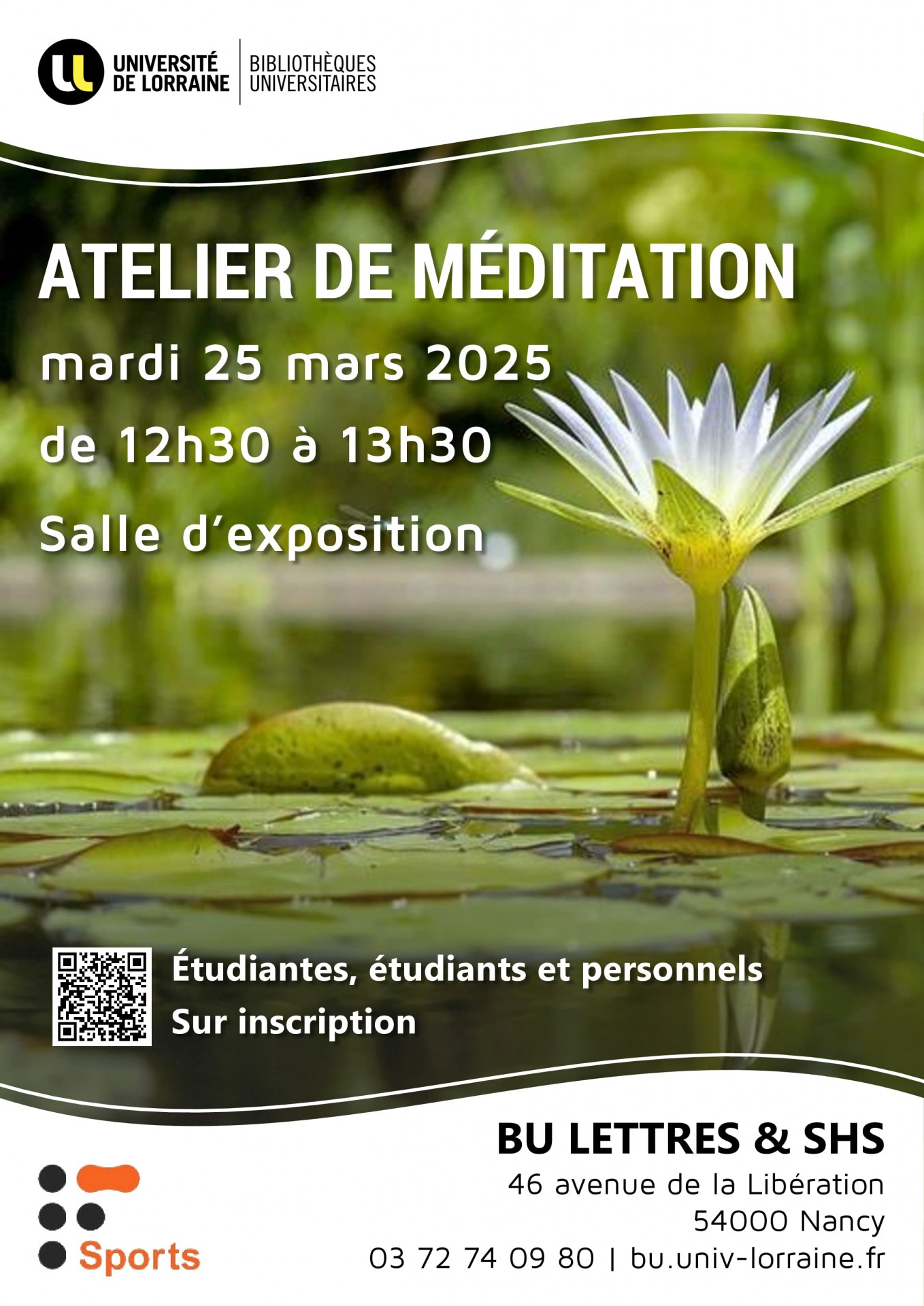 La BU Lettres & SHS vous propose un atelier nomade de relaxation animé par Cathy Hechner, enseignante au SUAPS de l'Université de Lorraine, le 25 mars 2025 de 12h30 à 13h30.