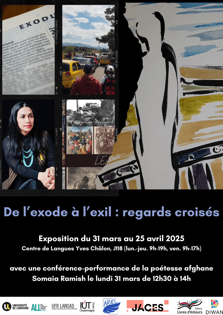 Sa conférence inaugurera l'exposition "De l'exode à l'exil : regards croisés" organisée au même endroit dans le cadre des JACES 2025, et visible du 31 mars au 25 avril. L'exposition part du discours sur l'exode et l'exil de deux auteurs ARIEL, la romancière et journaliste indienne Puja Changoiwala (en résidence en 2024-25) et le poète palestinien Najwan Darwish (en résidence l'an prochain), ainsi que de Somaia Ramish. Elle présente également les textes et dessins envoyés par des membres de la communauté universitaire autour de l'exode et de l'exil, pour offrir des regards croisés sur ces questions au coeur de l'actualité.