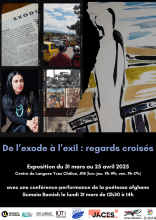 L'exposition sera inaugurée par Somaia Ramish, poétesse afghane en exil et activiste, invitée du festival "Livres d'Ailleurs", qui proposera une conférence / performance autour de sa poésie sur les thèmes de l'exode et de l'exil le lundi 31 mars 2025 de 12h30 à 14h, également au Centre de Langues Yves Châlon (salle J118) du Campus Lettres et Sciences Humaines de Nancy.