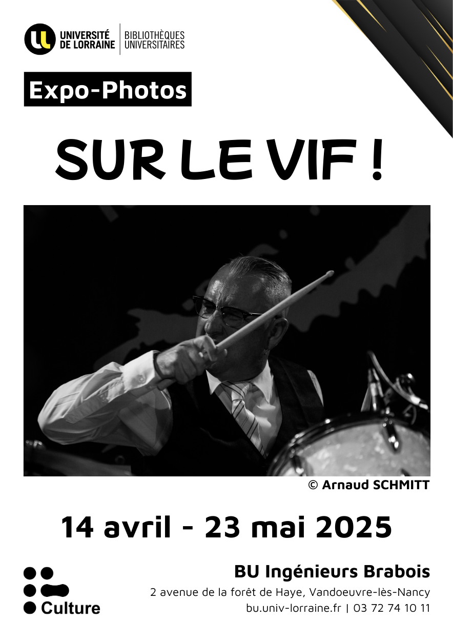 Du 14 avril au 23 mai 2025, la bibliothèque universitaire Ingénieurs Brabois vous propose l’expo-photos d’Arnaud Schmitt (photographe et musicien amateur @ziarn) intitulé : « Sur le vif ! »