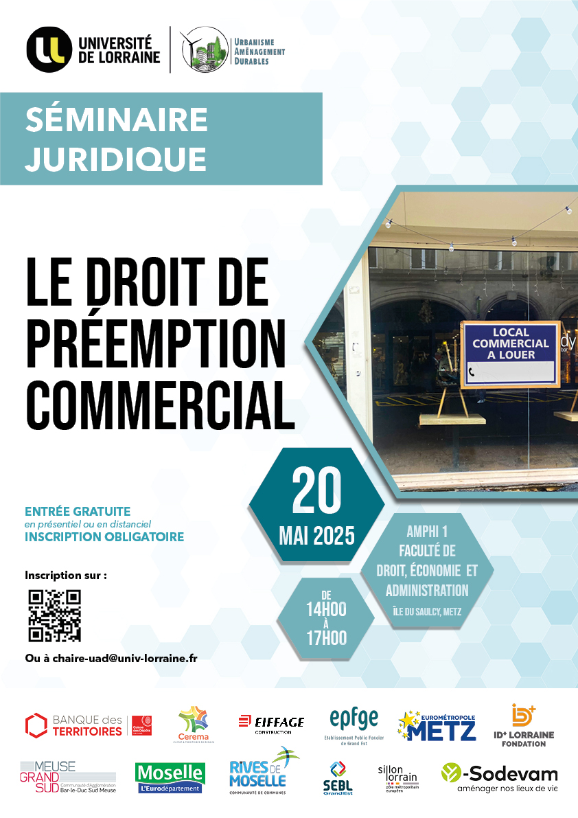 Celui-ci portera sur « Le droit de préemption commercial » et se tiendra le mardi 20 mai 2025 de 14h00 à 17h00 en amphi 1 de la Faculté de Droit, Économie et Administration de Metz (Île du Saulcy).