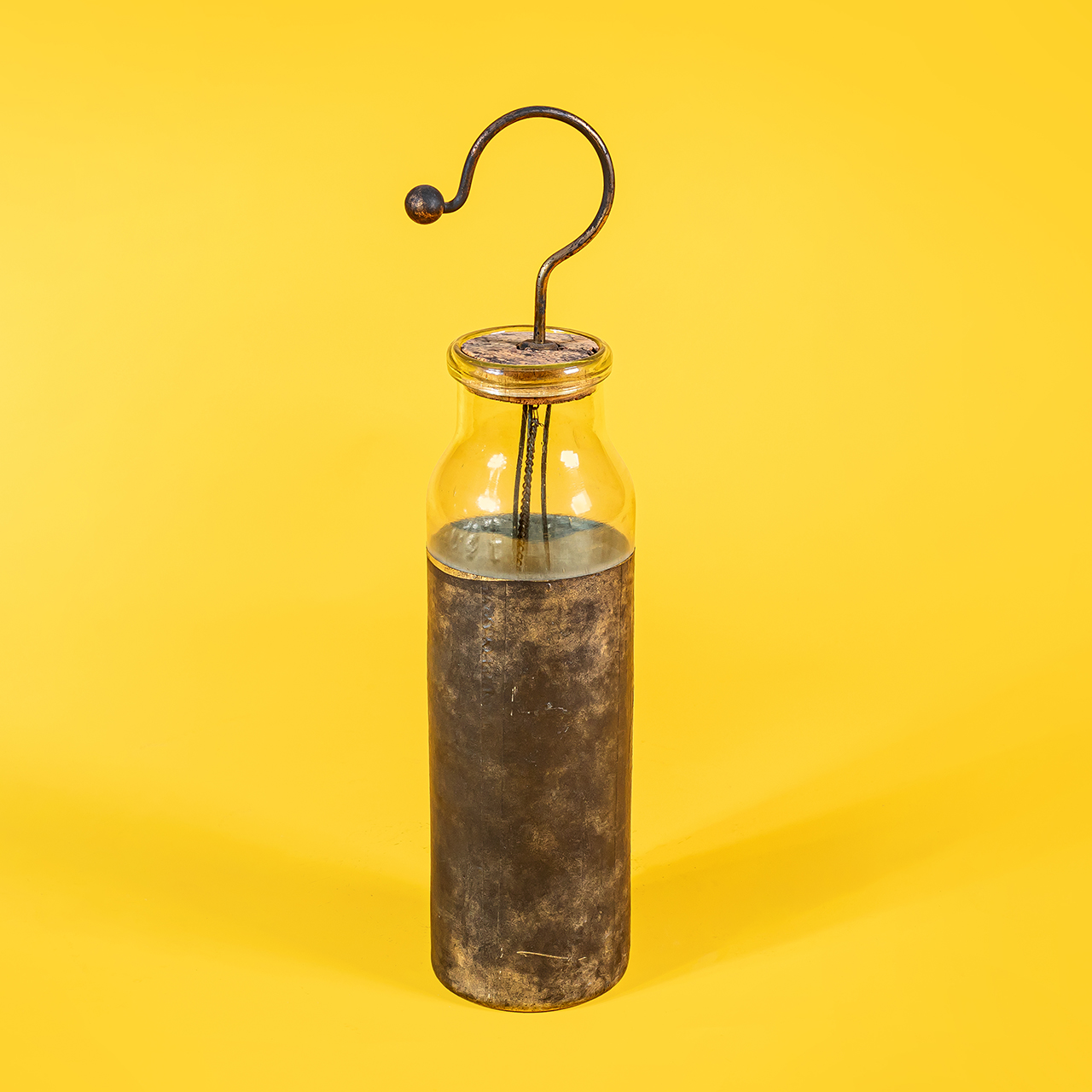 Une bouteille de Leyde sert à accumuler et stocker l’électricité. Elle est composée de verre, de feuillets d’étain et d’une tige en laiton. Cette tige recourbée en crochet se termine par une boule, c’est par là qu’on charge la bouteille grâce à une machine électrostatique. L’ensemble est isolé par le verre de la bouteille. L’énergie électrique est stockée par la séparation des charges positives et négatives. C’est en reliant les deux parties conductrices qu’on décharge la bouteille. Des bouteilles comme celles-ci ont été achetées par la Faculté de Nancy dès les premières années de sa création. L’électricité statique était étudiée en cours de physique appliquée.