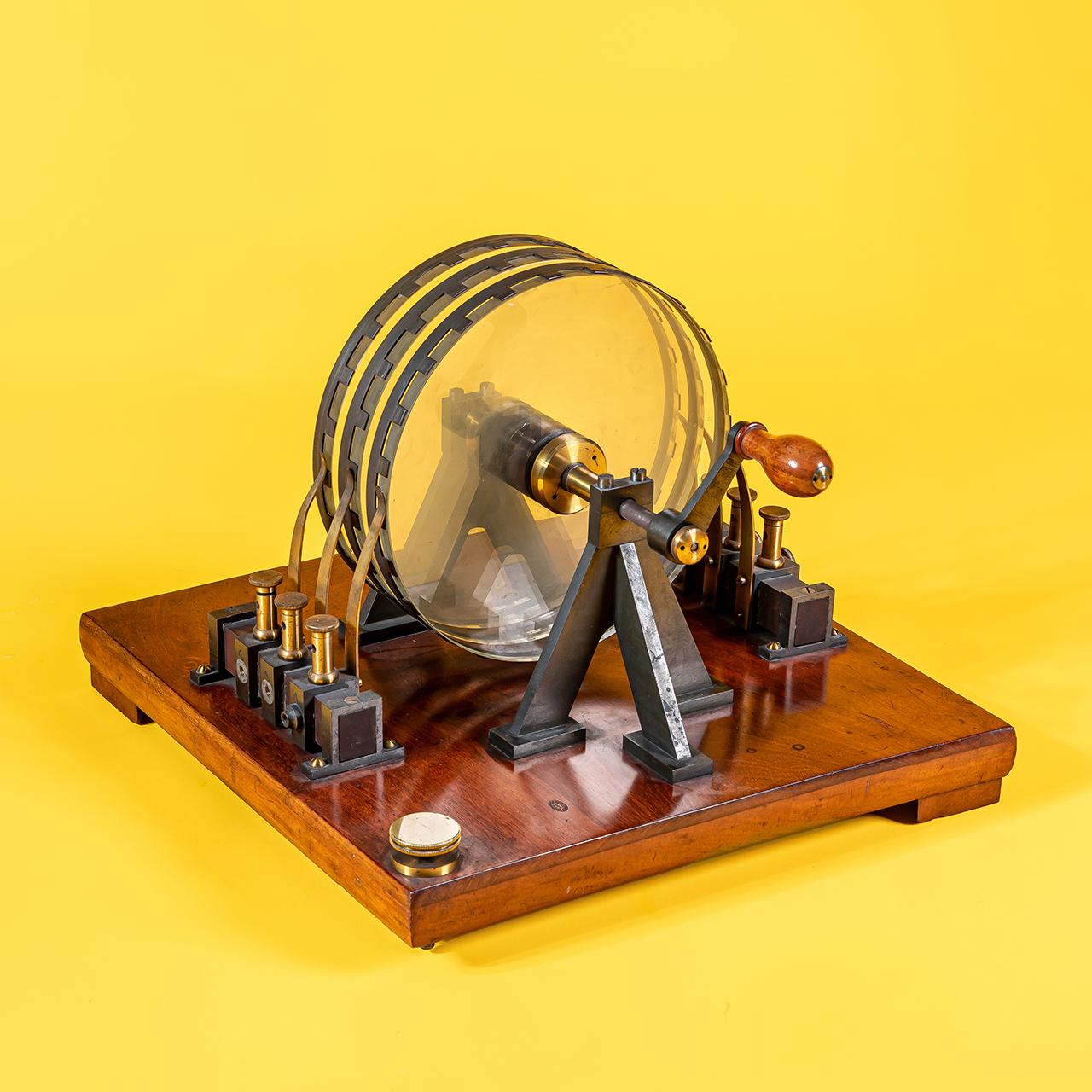 Ce triple interrupteur tournant servait à couper et rétablir le courant d’un circuit électrique de façon régulière, à une vitesse que l’expérimentateur choisissait. On l’utilisait avec une bobine. Son principe ? Les roues en verre sont cerclées de dents métalliques, qui sont reliées à des bornes. Quand on actionne la manivelle qui fait tourner les roues, les lames sont en contact alternativement avec du verre, isolant, et du métal, conducteur.