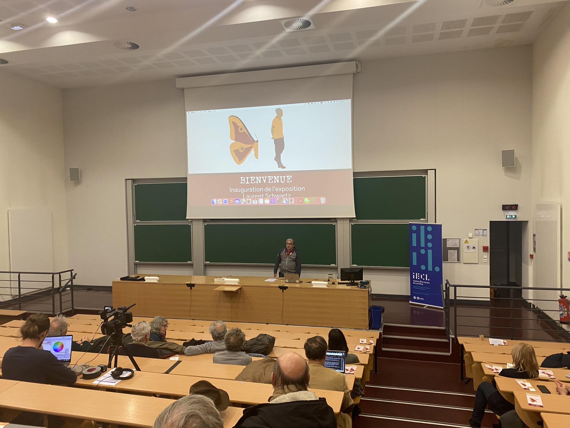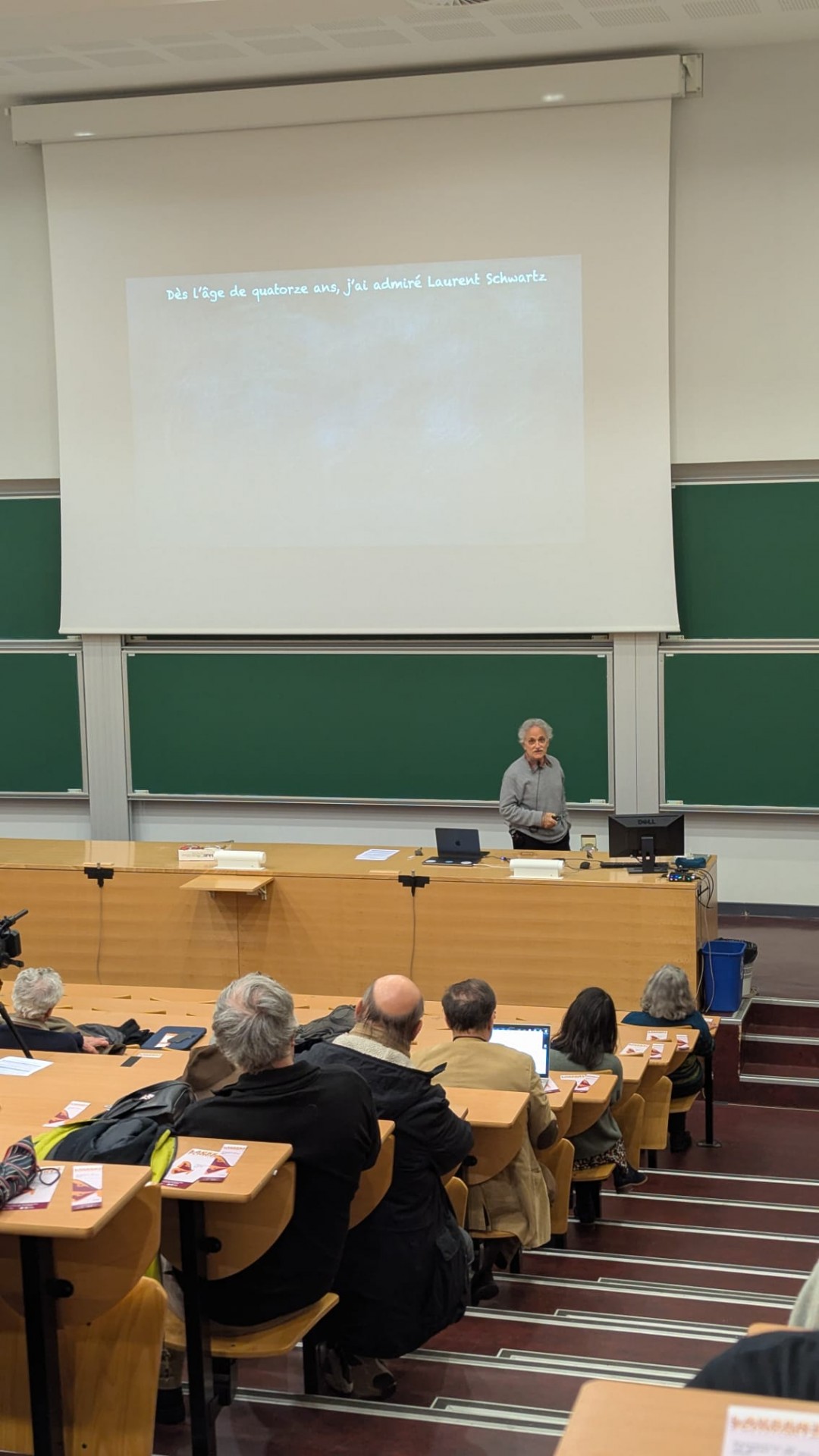 Ensuite, Michel Broué, Professeur émérite à l'Université de Paris-Cité et membre actif du comité des mathématiciens aux côtés d'Henri Cartan et de Laurent Schwartz dans les années 1970-1980, a dressé un portrait vivant de ce dernier en abordant divers sujets comme la morale, l’engagement, la politique et l’amitié. Il a dépeint avec force son humanité et son militantisme. Juste avant la visite, Hervé Pajot, Professeur à l’Université de Grenoble et instigateur de l'exposition qui a été présentée pour la première fois à l'Institut Fourier en 2024, est intervenu pour expliquer la naissance du projet. Également à l'initiative de la BD sur Laurent Schwartz parue en 2024, il a aussi mis à l’honneur par ce biais d’autres grands mathématiciens et mathématiciennes pour rendre les mathématiques compréhensibles au plus grand nombre. L’inauguration s’est achevée avec l’exposé de Frédéric Brechenmacher, Professeur d’Histoire des sciences à l’École polytechnique. Il a expliqué le rôle central de Laurent Schwartz pour la réforme de l’enseignement et la création de laboratoires de recherche à l’école Polytechnique mais aussi l’ambivalence des sentiments qu’il avait pour cette institution.