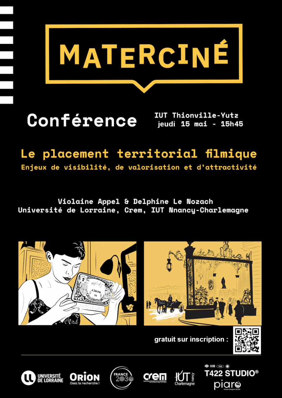 Cette conférence se déroule en deux temps. Un premier est consacré aux spécificités du placement territorial dans les longs-métrages de fiction. Comment le territoire est-il montré et mis en scène ? Quelles représentations de la région Grand Est dans les films s’en dégagent ? Un deuxième temps propose un focus sur la ville de Nancy au cinéma puis sur la création d’un dispositif innovant de marketing territorial.