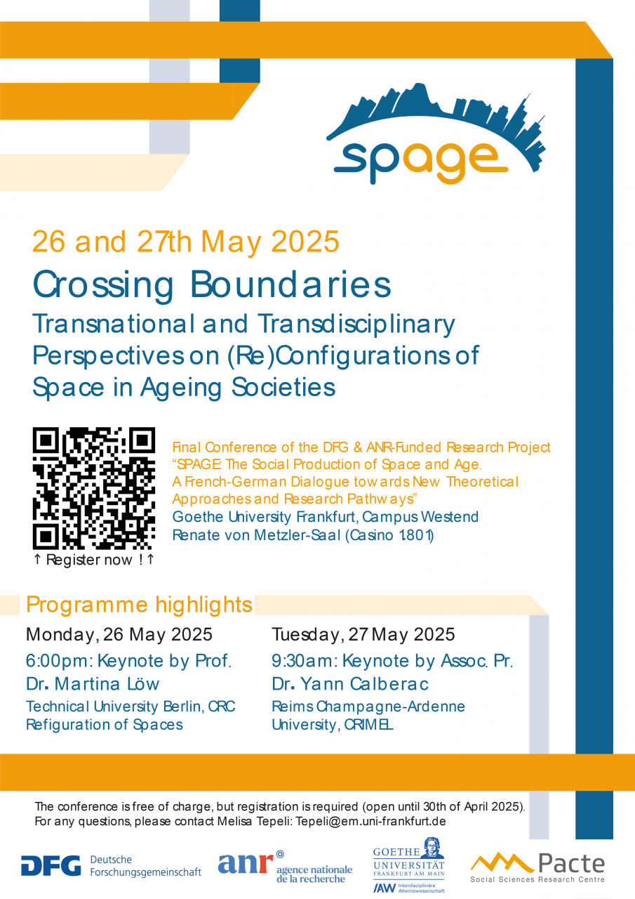L'équipe de recherche du projet SPAGE a le plaisir de vous convier à la conférence "Crossing Boundaries: Transnational and Transdisciplinary Perspectives on (Re)Configurations of Space in Ageing Societies", qui se tiendra les 26 et 27 mai 2025 à l'Université Goethe de Francfort, Allemagne.