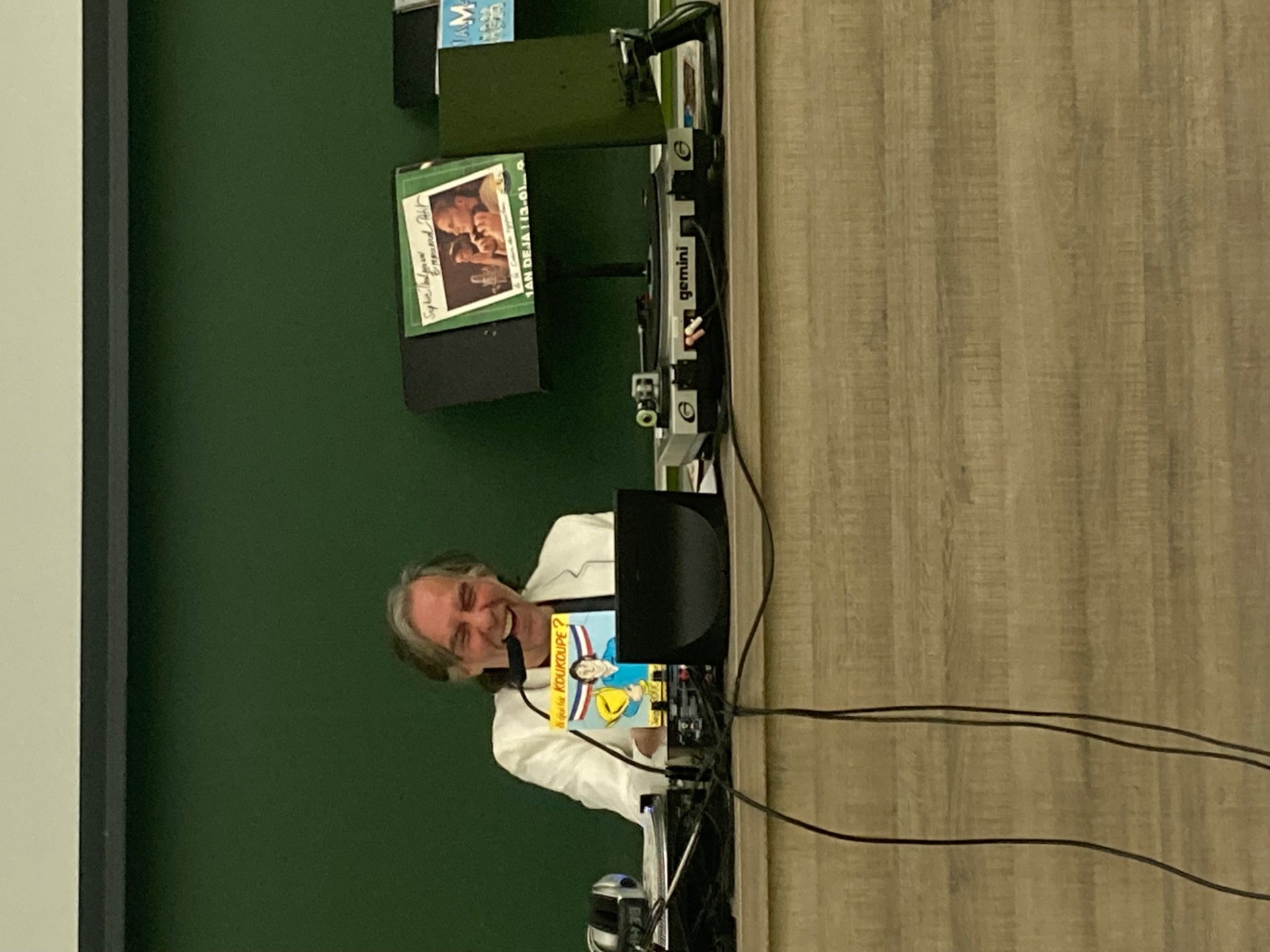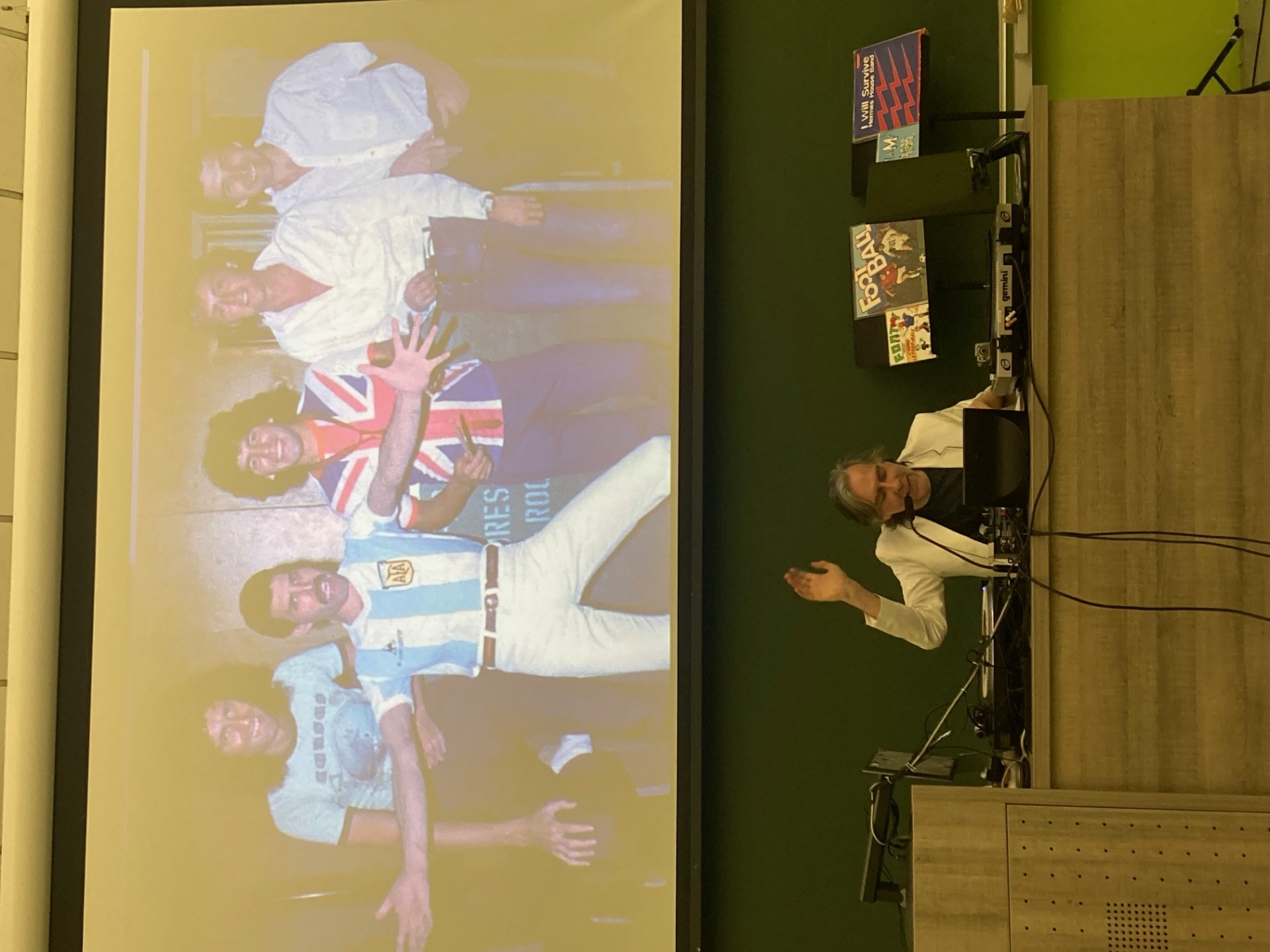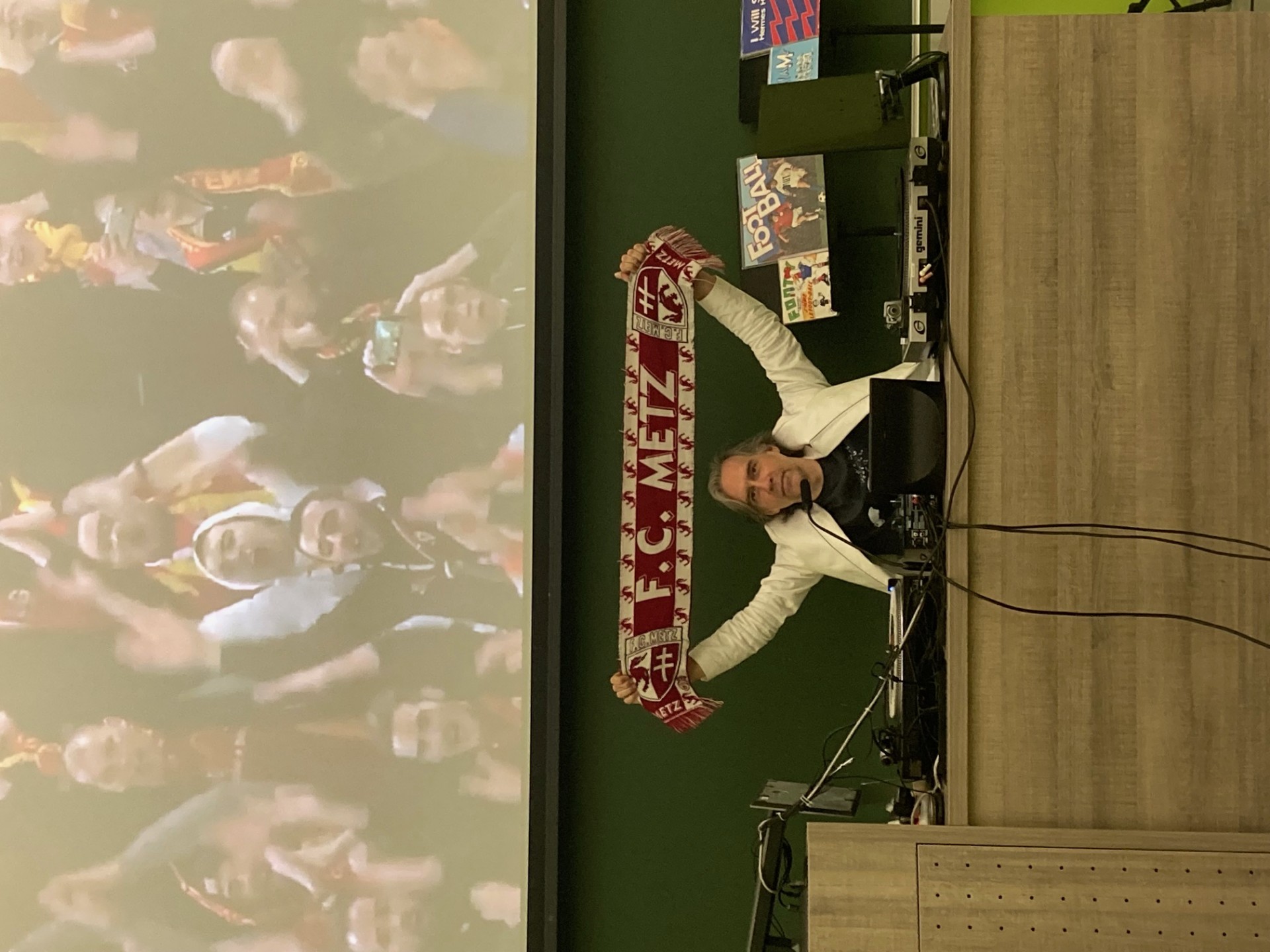 Hugues de l’association l’SKbL, alias « DJ Deschamps » accompagné de son acolyte Kevin du 9-3 ont fait découvrir ou redécouvrir, ce mardi 1er avril, au public de l’UFR SciFA des hymnes en lien avec le football, des années 60 aux plus récentes de 1998, 2006 ou encore 2018 :