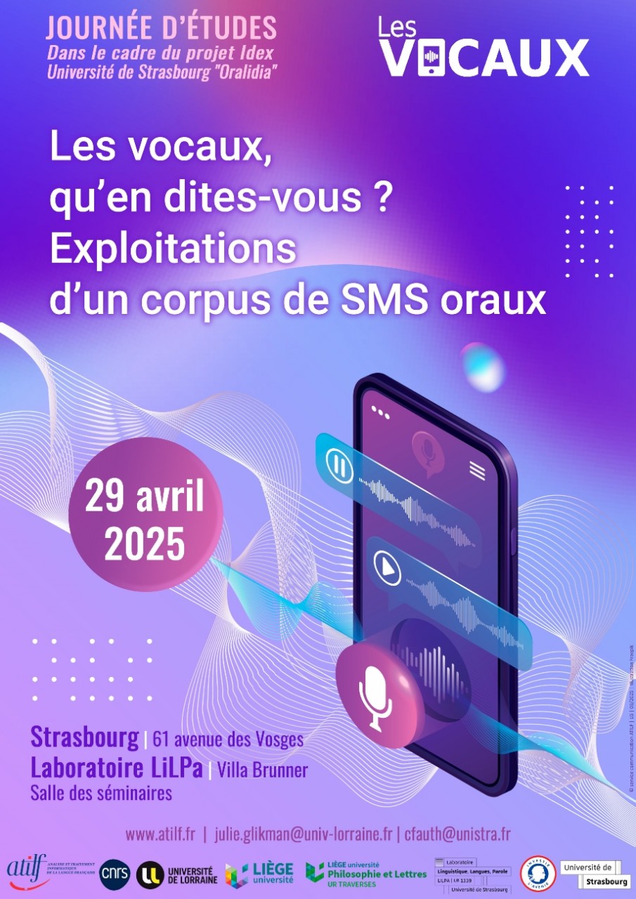Le projet Oralidia | Oralité et Diachronie a permis de constituer un corpus de sms** oraux "Les vocaux", nouveau mode de communication, disponible sur la plateforme Ortolang*, plate-forme d'outils et de ressources linguistiques pour un traitement optimisé de la langue française -> https://www.ortolang.fr/market/corpora/lesvocaux