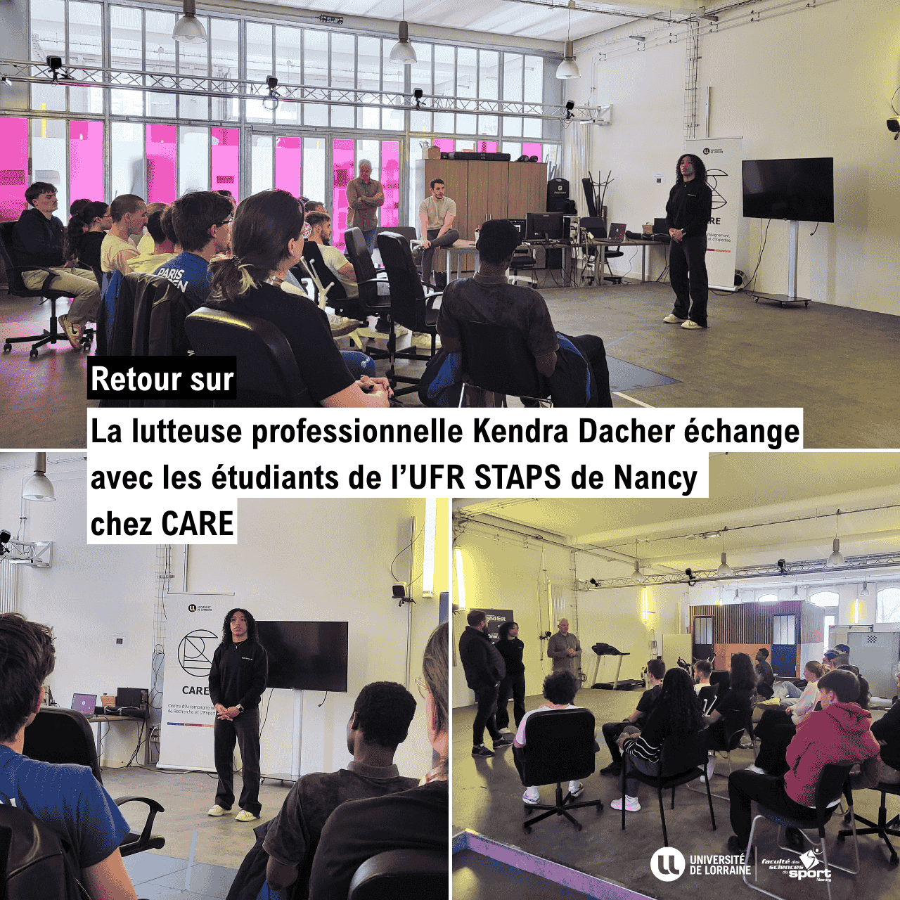 Ce lundi 31 mars 2025, le centre CARE a eu le plaisir d’accueillir Kendra Dacher, lutteuse depuis ses 12 ans, aujourd’hui membre de l’équipe de France et athlète à l’INSEP. Cette après-midi a été consacrée à un temps d’échange avec les étudiants de l’UFR STAPS de Nancy, venus découvrir les coulisses d’un sport encore trop peu médiatisé en France, mais pourtant très pratiqué : la lutte.