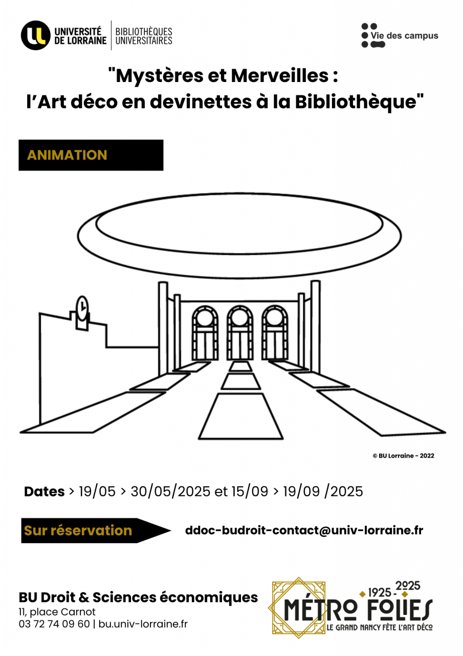 La BU Droit et Sciences économiques propose une animation dans le cadre des Métro’ Folies, évènement piloté par le Grand Nancy, pour mettre en valeur le patrimoine Art Déco de la Métropole.