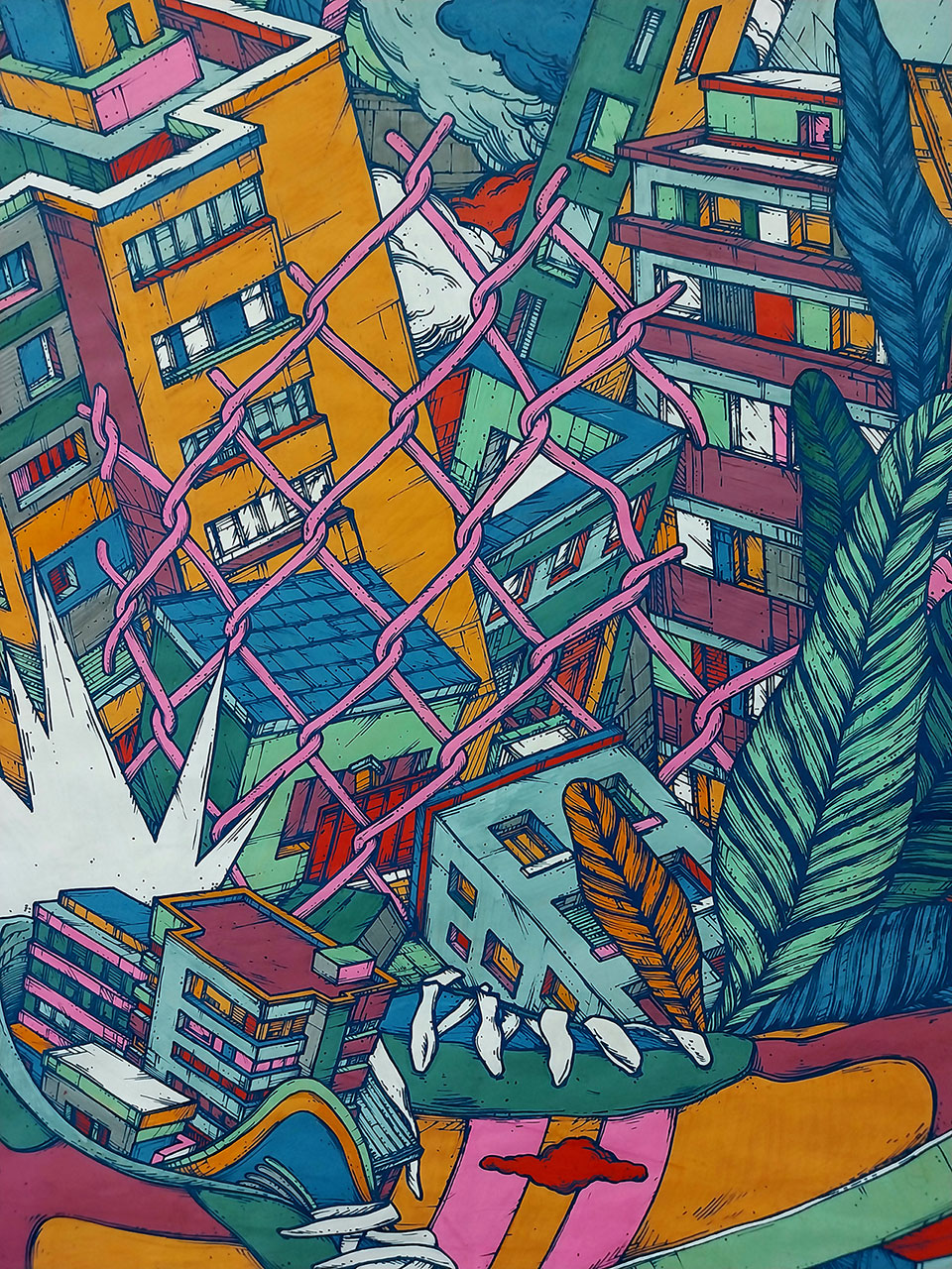 Papiers, carnets d’esquisses, friches industrielles, panneaux, vêtements, chaussures, boîtes à clefs, skateboards : il passe avec aisance d’un support surprenant à un autre plus classique pour imprimer sa trace d’artiste sur nos rétines. Si son style graphique s’inspire de la gravure ancienne, ses thématiques puisées dans son quotidien sont urbaines et actuelles. Un immeuble pousse dans une sneaker ou se métamorphose en verre à cocktail, les motifs s’enchevêtrent dans une profusion de détails et dans une explosion de couleurs fraîches et fluos. Teinté de surréalisme, ses compositions ne sont pas sans rappeler les structures sans fin de Maurits Cornelis Escher. Pour son exposition Abstract Day au Préau, RUNS va là encore dessiner sur les murs de la galerie mais également sur un bâtiment du campus de l’INSPÉ de Lorraine, créant une peinture murale où des fragments dévoilent une ville imaginaire à la Giovanni Batista Piranesi.