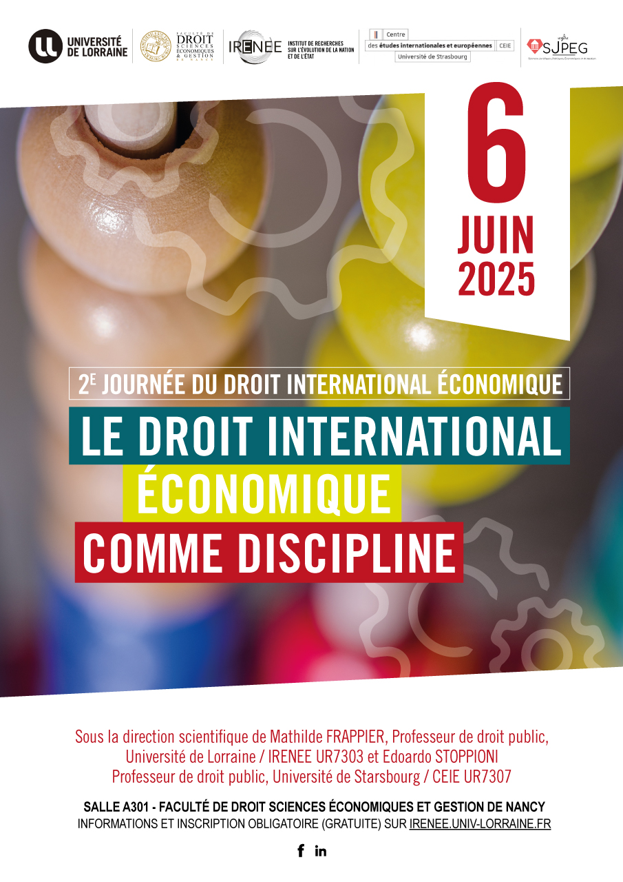 Afin de poursuivre les échanges lancés en 2024 lors de la première journée du droit international économique, et de continuer à mettre en valeur la doctrine francophone sur le sujet, le CEIE et l’IRENEE convient cette année à Nancy, un ensemble d’universitaires et de praticiens, exerçant en France et à l’étranger, afin de discuter du droit international économique en tant que discipline.