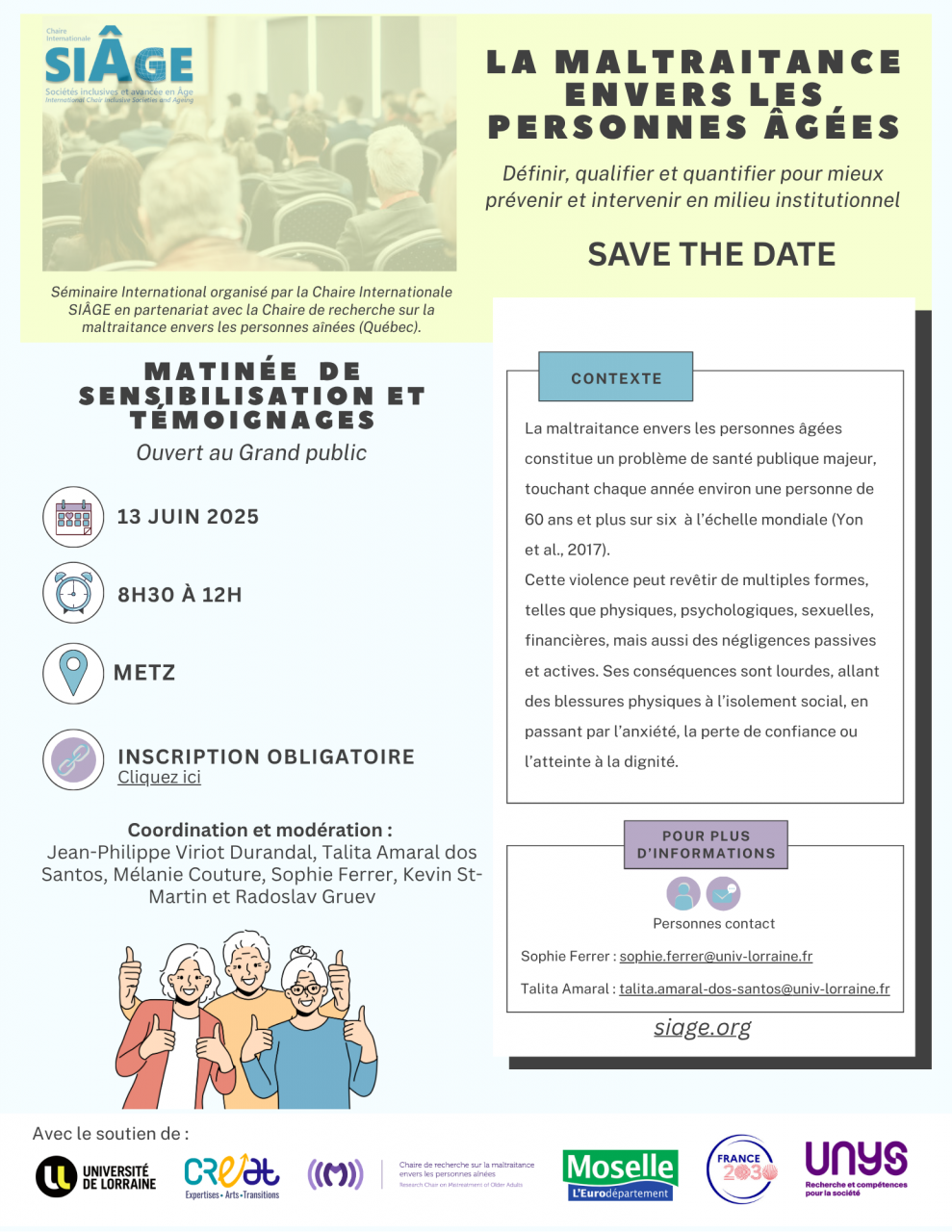 À l’occasion de la Journée mondiale de sensibilisation, la Chaire Internationale SIÂGE (Université de Lorraine) et la Chaire de recherche sur la maltraitance envers les personnes aînées (Université de Sherbrooke, Québec) organisent un séminaire international sur la maltraitance des personnes âgées – un enjeu majeur de santé publique.