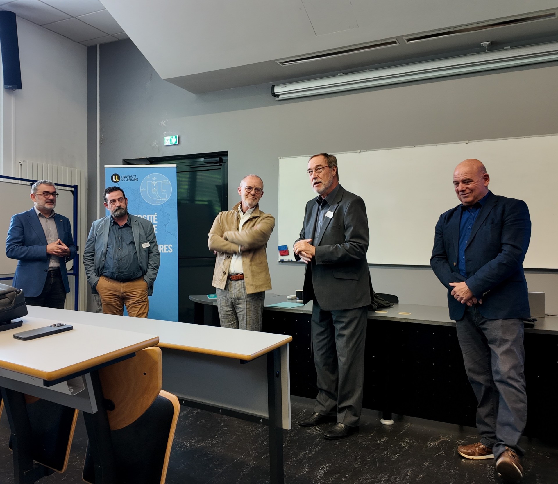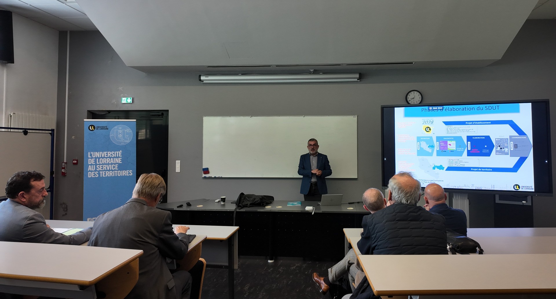 Ce temps d’échange avec les acteurs du territoire s’est déroulé en présence de représentants politiques : Marc ZINGRAFF, Délégué aux antennes universitaires et au rayonnement universitaire territorial à la Région Grand Est et Maire de Sarreguemines, Jean-Paul DASTILLUNG, 9è Vice-Président, délégué à l'Enseignement Supérieur, à la Recherche et à l'Innovation au Département de la Moselle, Jean-Claude CUNAT, Vice-président en charge de l’enseignement supérieur à la Communauté d’Agglomération de Sarreguemines Confluences, et trois VP de l’Université de Lorraine, Stéphane LEYMARIE, Vice-Président Stratégie territoriale et Vie institutionnelle, Pascal TISSERANT, Vice-Président Égalité Diversité Inclusion et Jules FERBER, Vice-Président étudiant.