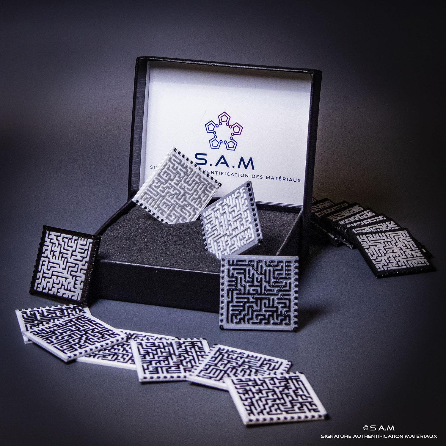 Sylvain Lefebvre : Au premier abord, ce token, qui peut être utilisé comme dispositif anti-contrefaçon, clé de sécurité ou encore certificat d’authenticité, ressemble à un simple carré de plastique présentant une sorte de labyrinthe en relief sur l’une de ses faces. Il suffit de le placer sur le lecteur que nous avons conçu pour extraire à la fois l’information contenue dans son volume et la signature propre au matériau. Ces données internes protègent celles contenues dans le labyrinthe de surface. Comme la clé de décodage est stockée dans le token de manière totalement passive, elle n’émet pas de signal et n’est pas cyber-attaquable. De plus, avec plus de 200 bits d’encodage disponibles, la solution proposée par S.A.M, issue de nos recherches, offre un nombre astronomique de labyrinthes possibles, et des risques de collision quasiment nuls.