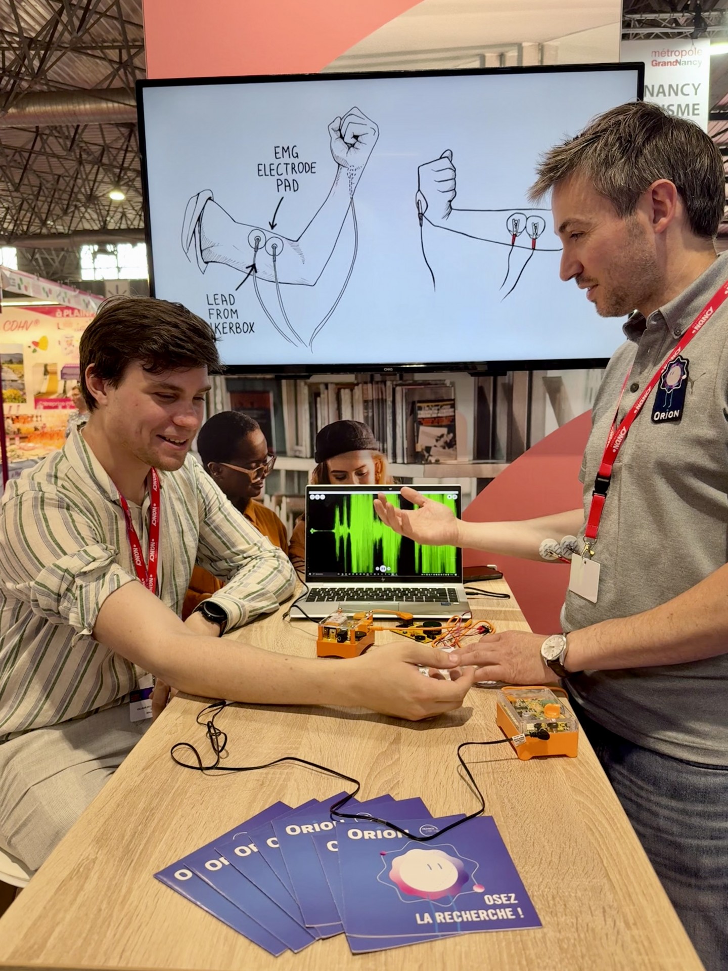 club ORION Human-Interact a captivé le public avec une expérience étonnante où un signal électrique passe du cerveau d’une personne aux muscles d’une autre, illustrant la communication neuronale.