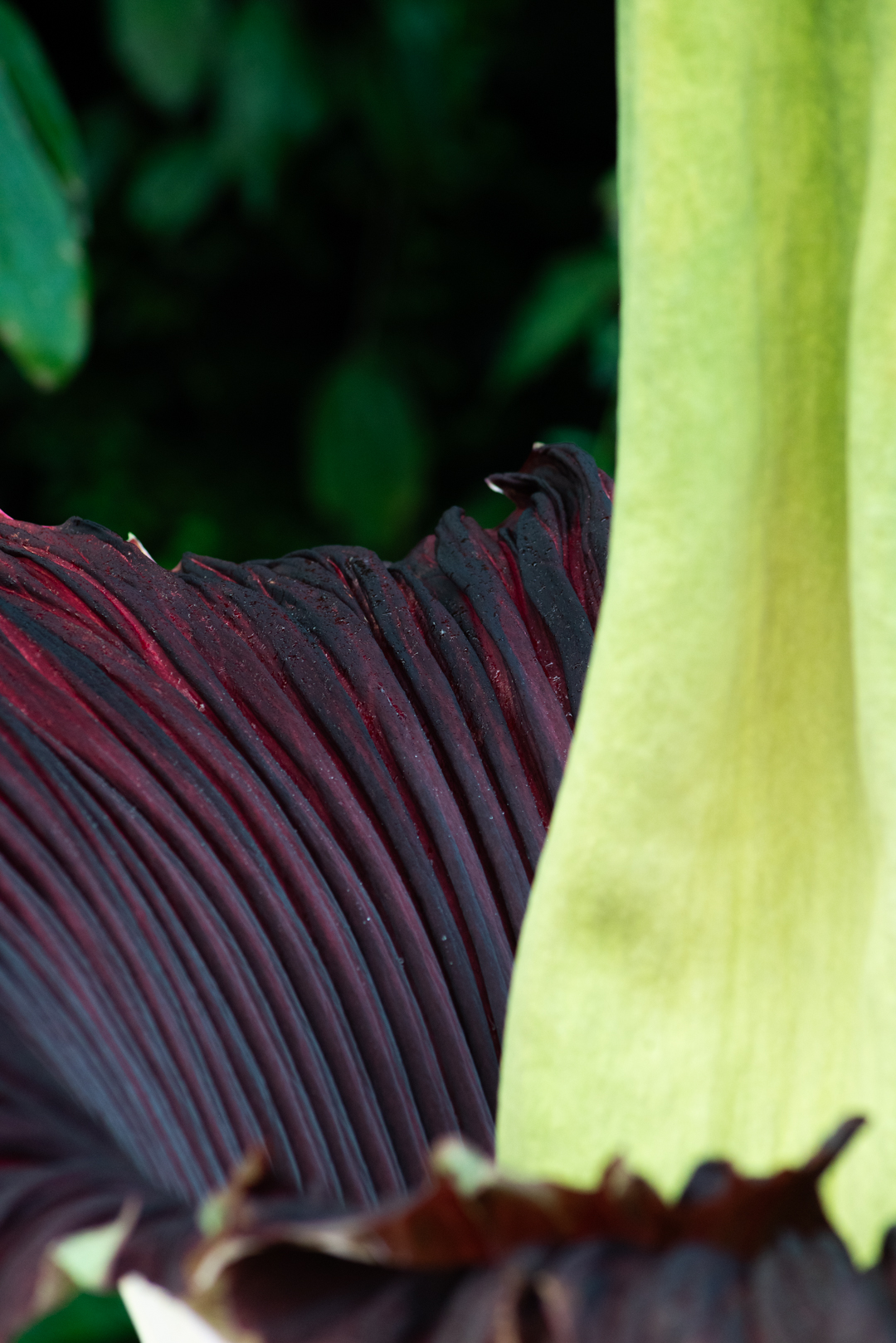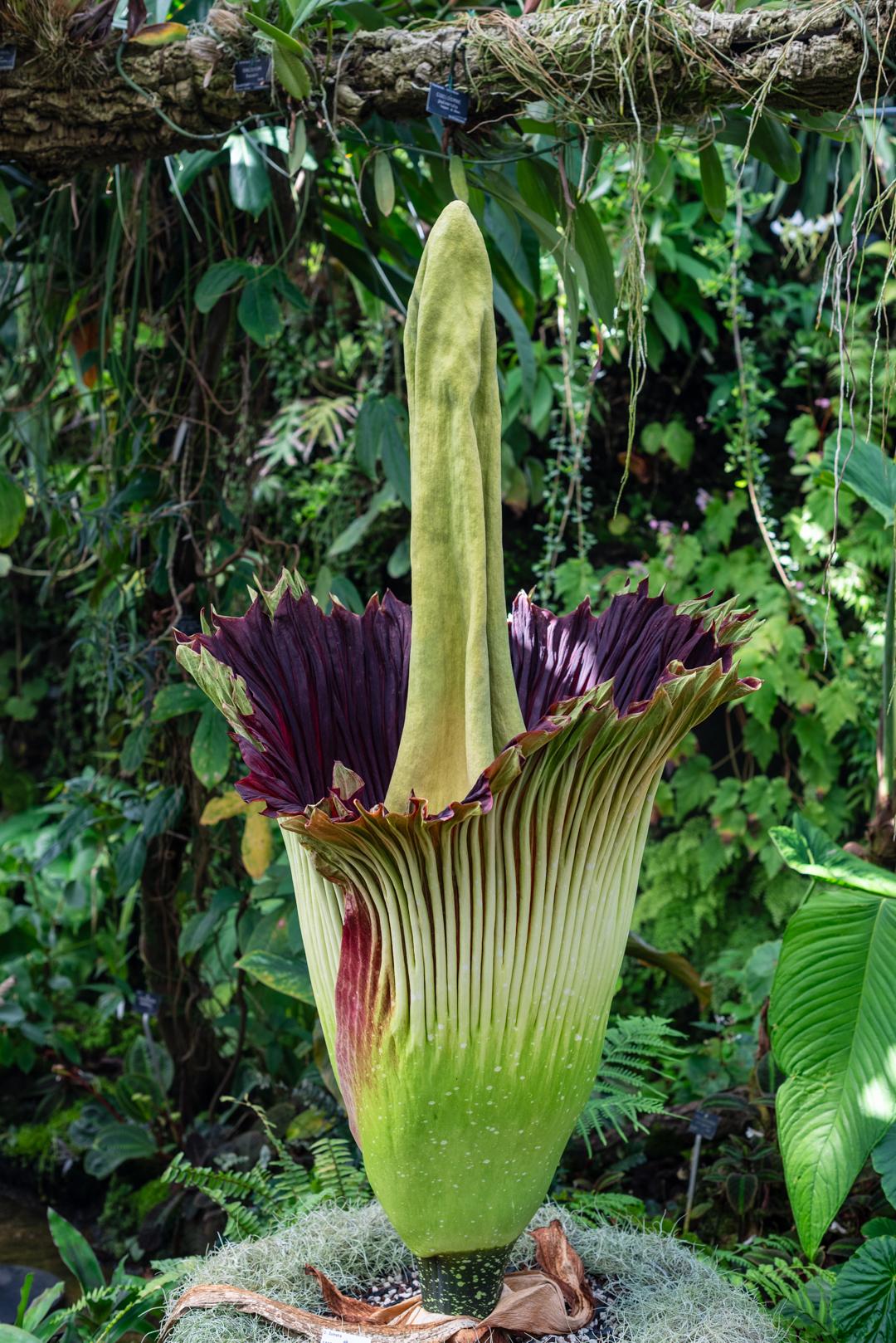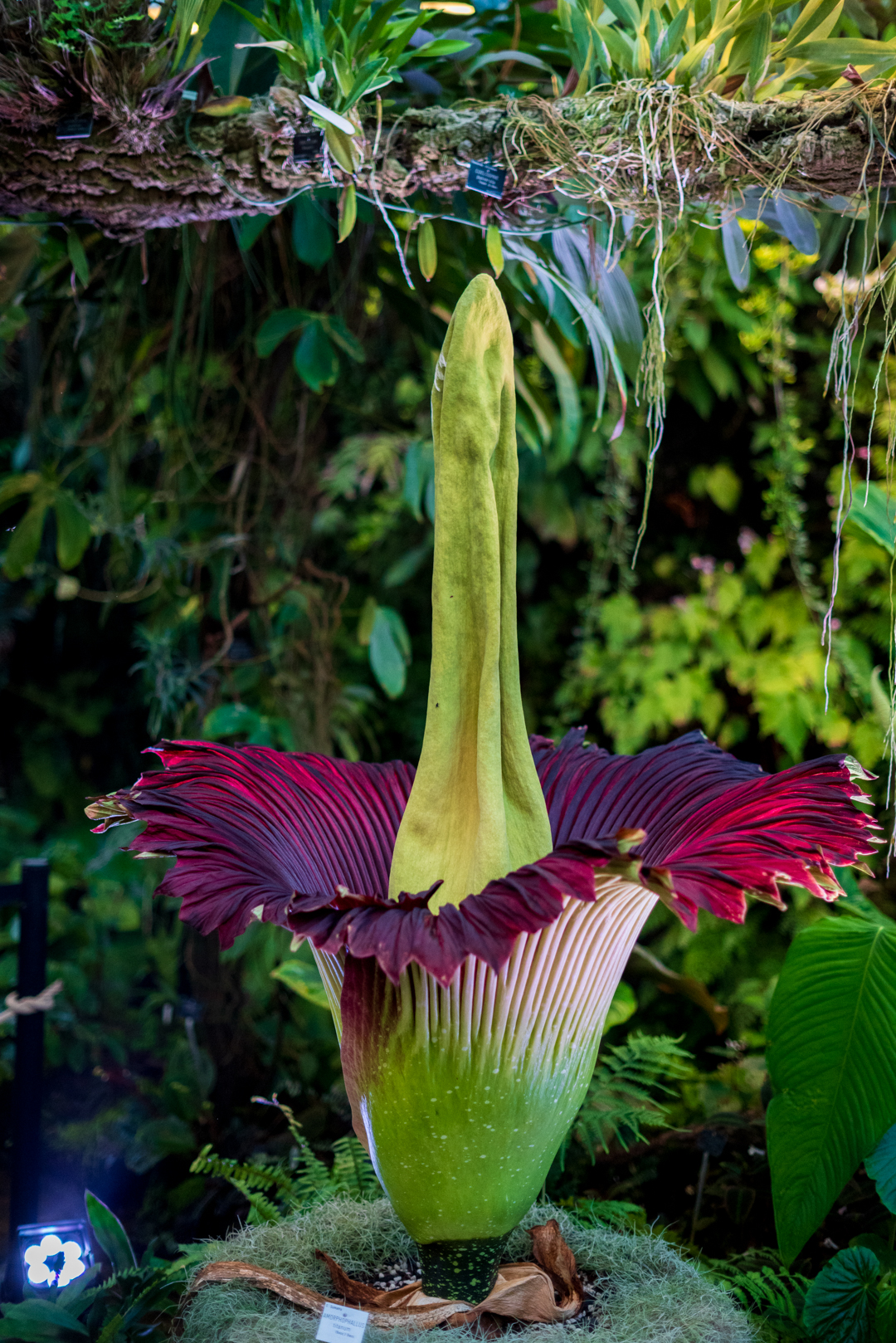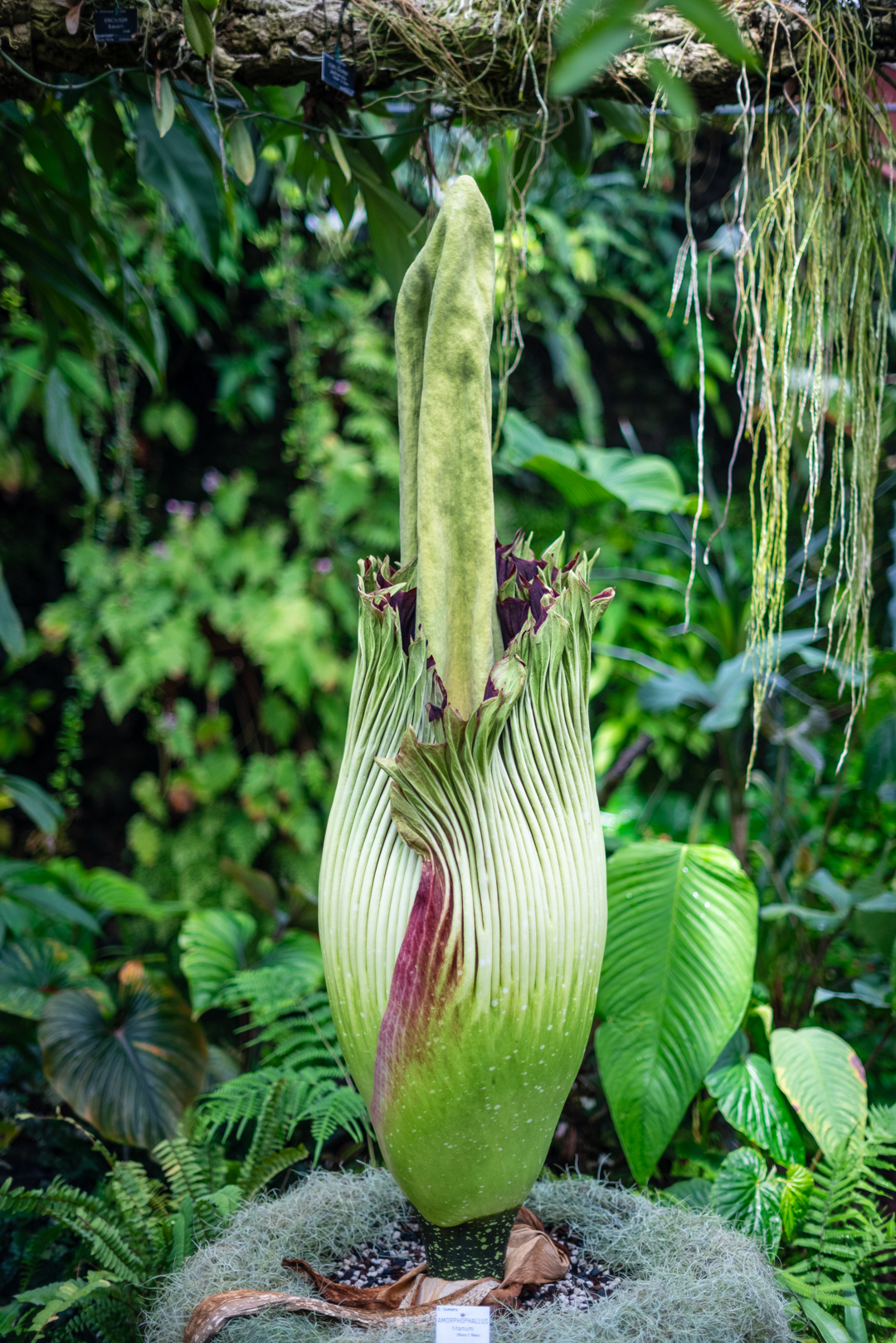 Issu d’une des trois plantules données par le Jardin botanique de Meise en 2018, ce spécimen très rare d'amorphophallus titanum, plus familièrement appelé « Pénis de Titan » est âgé de 7 ans et sa floraison n'a duré que 48h environ. Cette plante endémique des forêts tropicales de Sumatra, classifiée en danger (EN) dans la liste rouge de l'IUCN pourrait dépasser les 2 mètres et pèse déjà 21 kg. De l’apparition du bourgeon au-dessus du niveau de la terre jusqu’à l’ouverture de la spathe, il aura fallu environ 1 mois et demi.