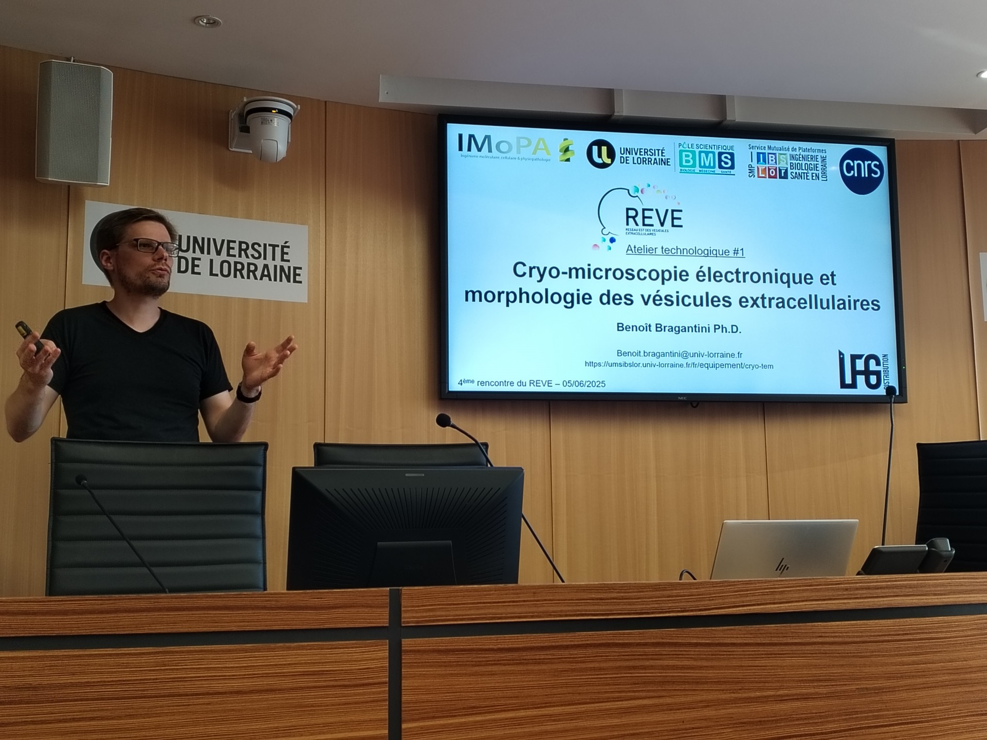 Le REVE regroupe les scientifiques de l’Est de la France intéressés par la thématique des vésicules extracellulaires, quel que soit leur domaine de recherche (agronomie, santé…). Il favorise les partages de méthodes et de connaissances. Au travers de rencontres régulières, ses membres peuvent présenter leurs travaux, découvrir de nouvelles technologies et échanger avec des experts locaux ou nationaux. Lors de la 4ème rencontre du REVE, la mobilisation de personnels d’IMoPA, du LIBio et du Service Mutualisé de Plateformes du pôle scientifique BMS a permis l’accueil de participants venant de Besançon, Dijon, Nancy, Reims et Strasbourg.