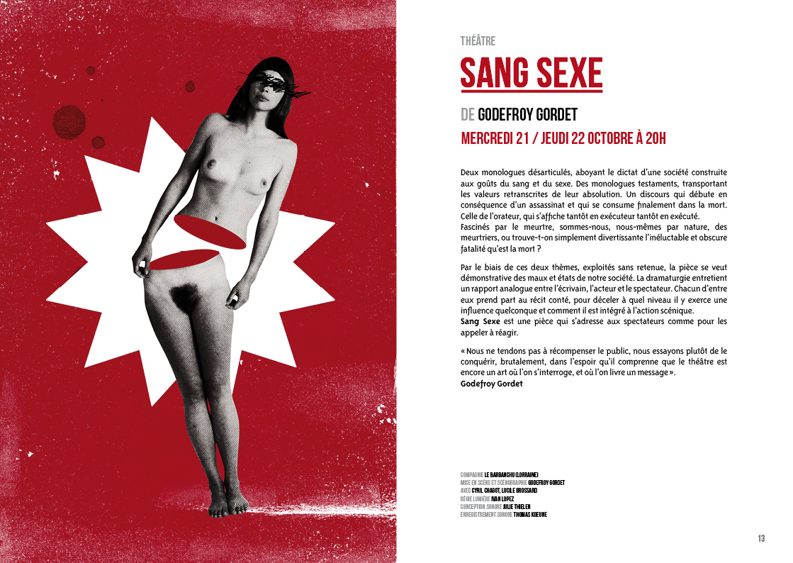 Sang-Sexe est une pièce qui s’adresse aux spectateurs comme pour les appeler à réagir. Nous ne tendons pas à récompenser le public, nous essayons plutôt de le conquérir, brutalement, dans l’espoir qu’il comprenne que le théâtre est encore un art où l’on s’interroge, et où l’on livre un message.