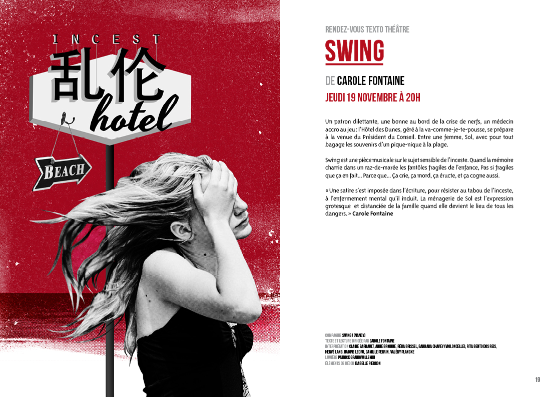 Swing est une pièce musicale sur le sujet sensible de l’inceste. Quand la mémoire charrie dans un raz-de-marée les fantôles fragiles de l’enfance, Pas si fragiles que ça en fait... Parce que... Ça crie, ça mord, ça éructe, et ça cogne aussi.