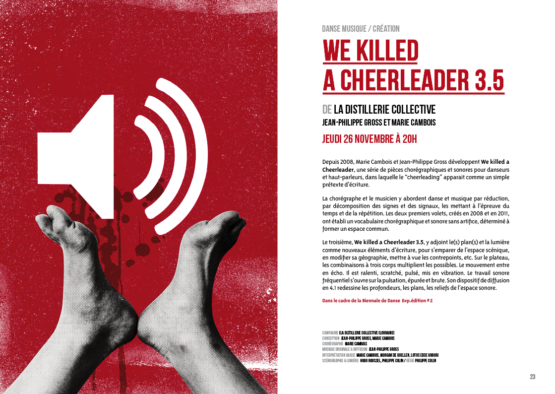 La chorégraphe Marie Cambois et le musicien Jean-Philippe Gross travaillent ensemble depuis 2008 à creuser le concept de We killed a cheerleader, une série de pièces chorégraphique et sonore pour danseurs et haut-parleurs. Emprunté à la populaire célébration sportive, le cheerleading est depuis le commencement de ce projet, un simple prétexte d’écriture où la danse et la musique sont envisagées par la réduction, la décomposition des signes et signaux, exposés à l’épreuve du temps (dans sa durée) et à la répétition. Les deux premiers volets, créés en 2008 et en 2011, ont permis de mettre en exergue un vocabulaire chorégraphique et sonore, sans artifice, déterminé à former un espace commun.