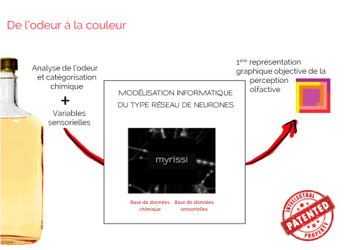 Issue de l’ENSAIA (Ecole Nationale Supérieure d’Agronomie et des Industries Alimentaires) Myrissi a été créée en 2014, après plus de 10 ans de recherche scientifique sur le lien existant entre couleur et odeur. En effet, si à ce jour plusieurs laboratoires dans le monde travaillent sur le sujet, Myrissi est la seule entreprise technologique à avoir modélisé le lien stable existant entre ces deux sens. Le procédé breveté de modélisation Myrissi, du type réseau de neurones s'appuie sur une base de données sensorielles de plus de 25 000 tests et une base de données chimiques.
