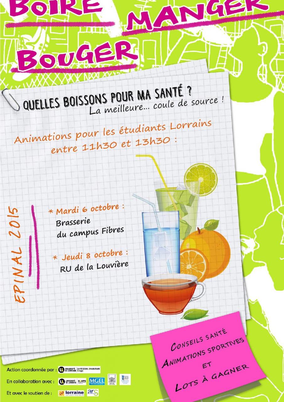 Le Service Santé Social des étudiants (SUMPPS) de l’Université de Lorraine met en place une campagne d’information et de prévention autour du thème BOIRE MANGER BOUGER (BMB) du 30 septembre au 10 décembre en collaboration avec le CROUS Nancy-Metz Lorraine, le Service des Sports Universitaire (SUAPS), la MGEL, la Maison de l’Etudiant d’Epinal, et avec le soutien de l’ARS et de la Région Lorraine. Sur chaque site, se tiendra une animation autour de stands de 11H30 à 13H30, où l’étudiant pourra rencontrer différents professionnels (du SUMPPS, du CROUS, du SUAPS, de la MGEL et de la Maison de l’étudiant). Par ailleurs, un professeur de sport du SUAPS proposera une animation sportive. Les étudiants pourront obtenir des documents pédagogiques, participer à des jeux, ainsi qu’à un quiz avec possibilité de gagner des lots. Les boissons seront à l’honneur et la question posée sera « Quelles boissons pour ma santé ? ». Si vous avez la réponse, rejoignez-nous vite sur les stands !