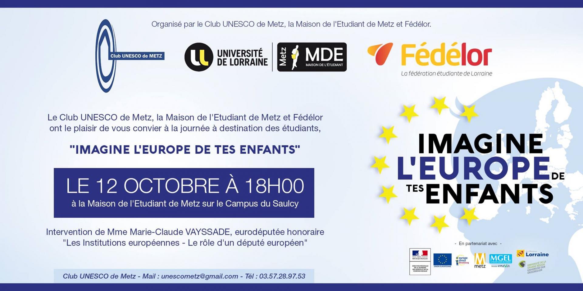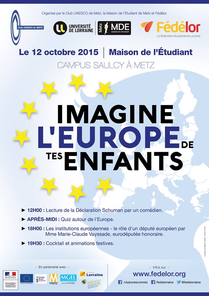La manifestation "Imagine l'Europe de tes enfants" aura lieu le 12 octobre à la MDE (Maison de l'Etudiant) de METZ sur l'ILE du Saulcy et est organisée par le Club UNESCO de Metz, la MDE et le FEDELOR. Toutes les informations et le programme se trouvent sur le site www.fedelor.org.