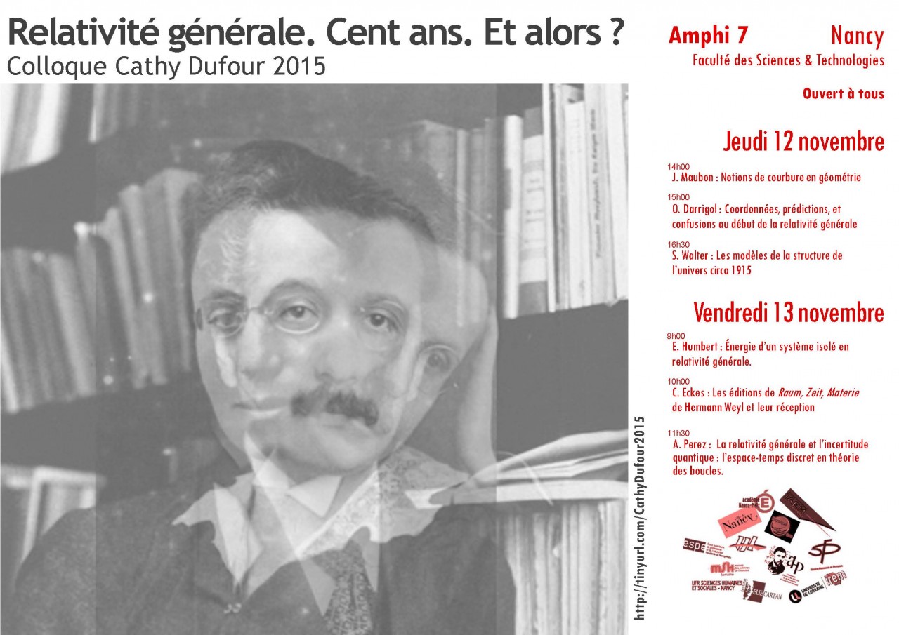 Le colloque « Cathy Dufour 2015 » sera consacré à la théorie de la relativité générale. Ce sera une occasion de célébrer le centenaire de cette théorie puisque les articles fondateurs paraissent en novembre 1915. Les intervenants sont : Julien Maubon (Institut E. Cartan – Université de Lorraine), Olivier Darrigol (Sphere - CNRS), Scott Walter (Centre Viete – Université de Nantes), Christophe Eckes (Archives Poincaré – Université de Lorraine), Alejandro Perez (Centre de physique théorique –Université d’Aix- Marseille), Emmanuel Humbert (Laboratoire de Mathématiques et Physique Théorique – Université de Tours).
