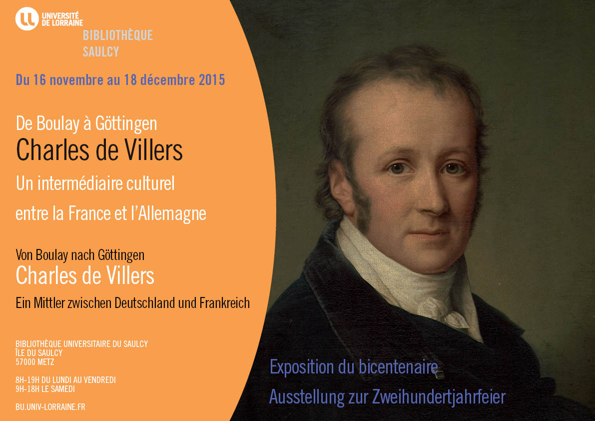 Diese Ausstellung zeigt auf 12 Postern in chronologischer Reihenfolge das Leben, das Werk und das Wirken Charles de Villers‘ zwischen 1765, dem Jahr seiner Geburt in Boulay, und 1815, dem Jahr seines Todes in Göttingen. Dieser französische Offizier, den die Revolution zur Emigration zwang, fand Zuflucht in Deutschland. Dort entdeckte er kulturelle Schätze, die er sich entschloss, dem französischen Publikum bekannt zu machen. Durch seine Mitarbeit an Zeitschriften, seine Publikationen, Übersetzungen und seine rege Korrespondenz mit zahlreichen deutschen und französischen Gelehrten wurde er zum wichtigen Mittler zwischen Frankreich und Deutschland.