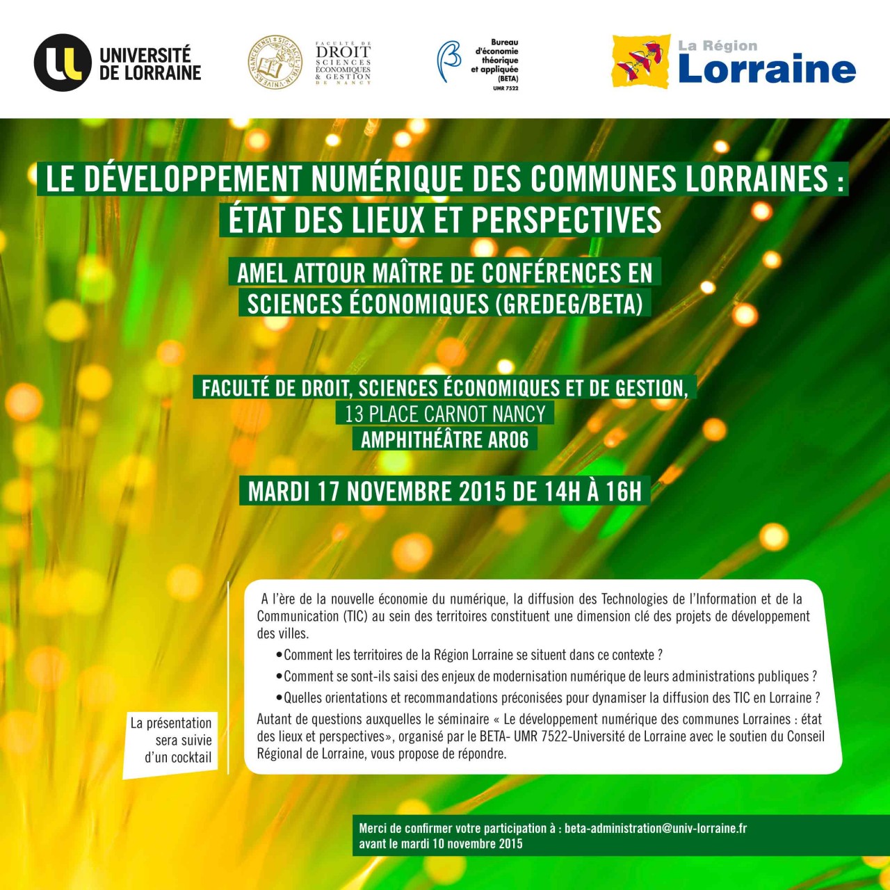 Date(s): Mardi 17 novembre 2015 - 14:00 - 16:00 Lieu(x): faculté de droit, sciences économiques et de gestion -Amphi AR06 13 Place Carnot Nancy numériqueéconomie
