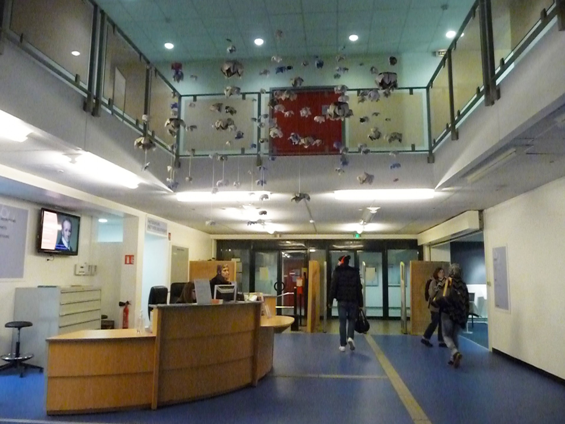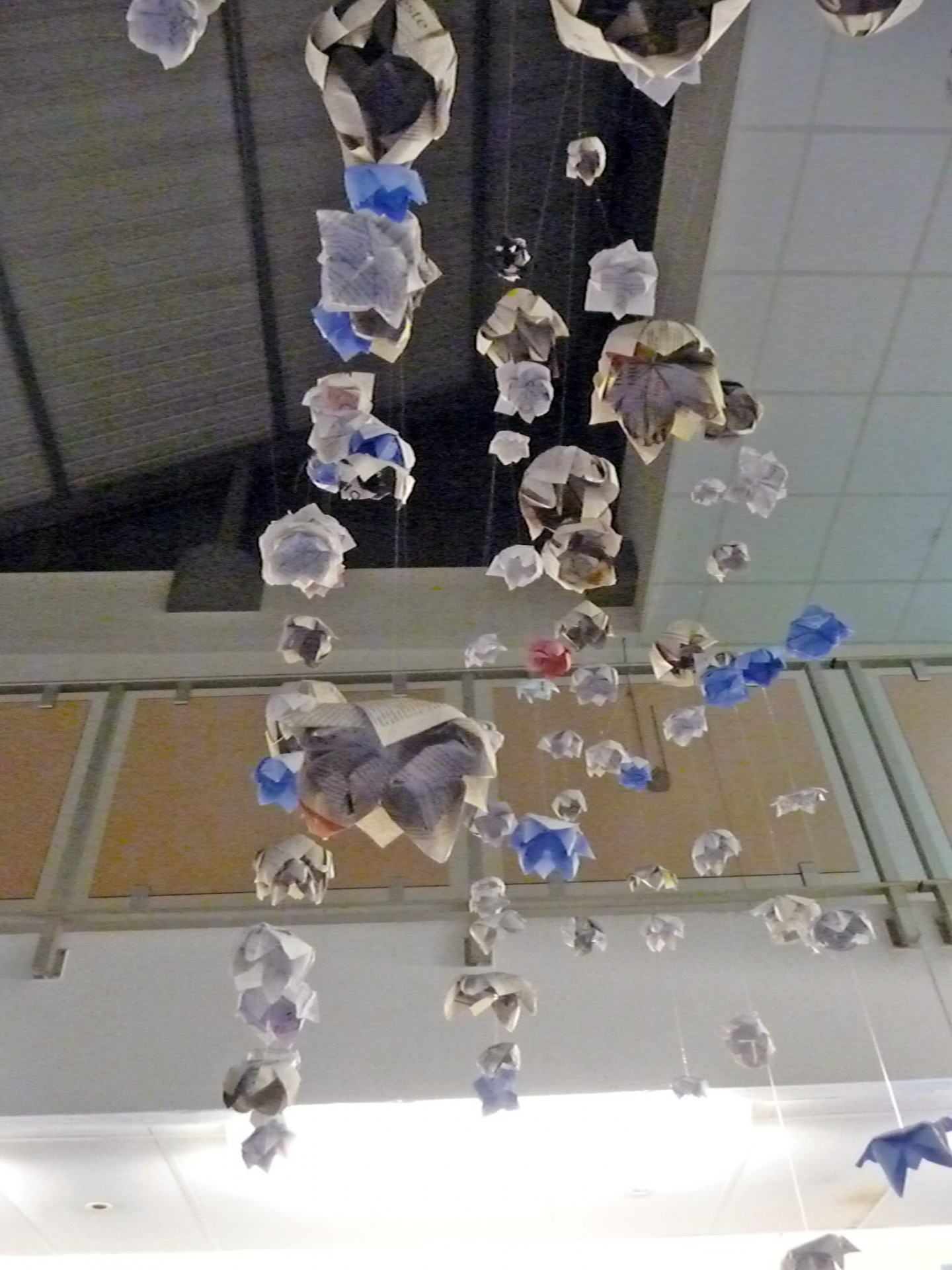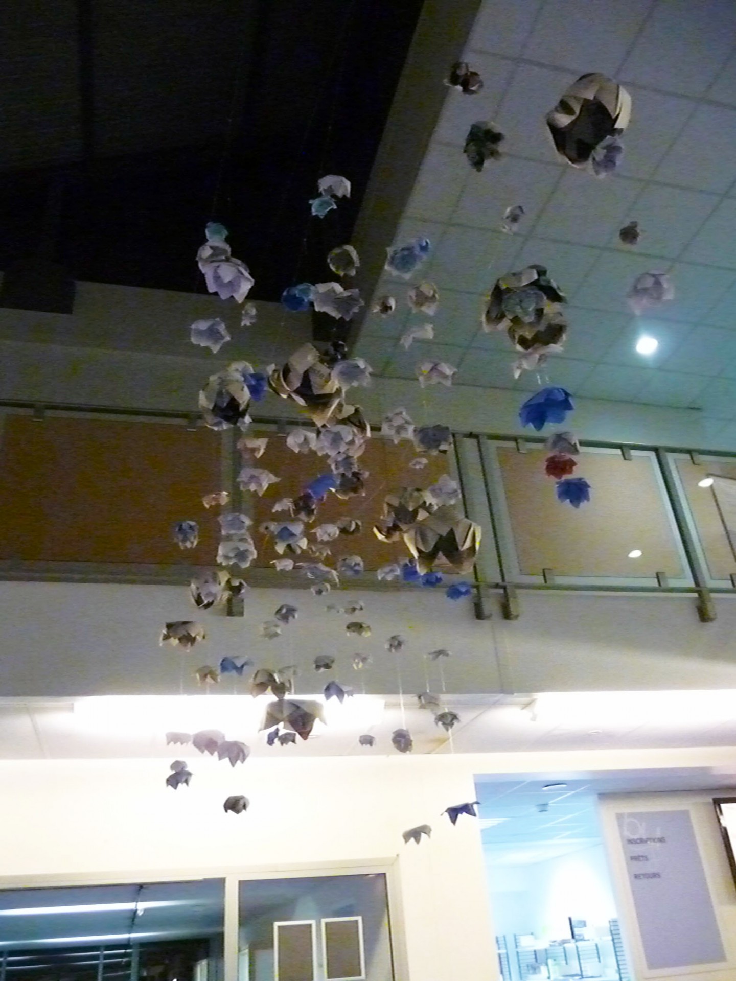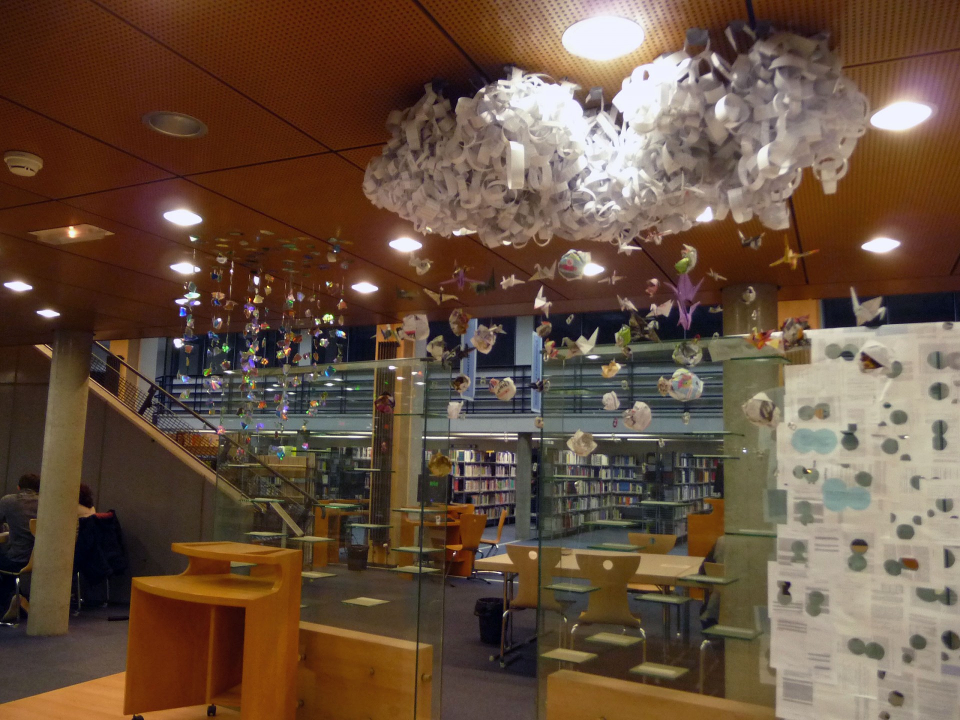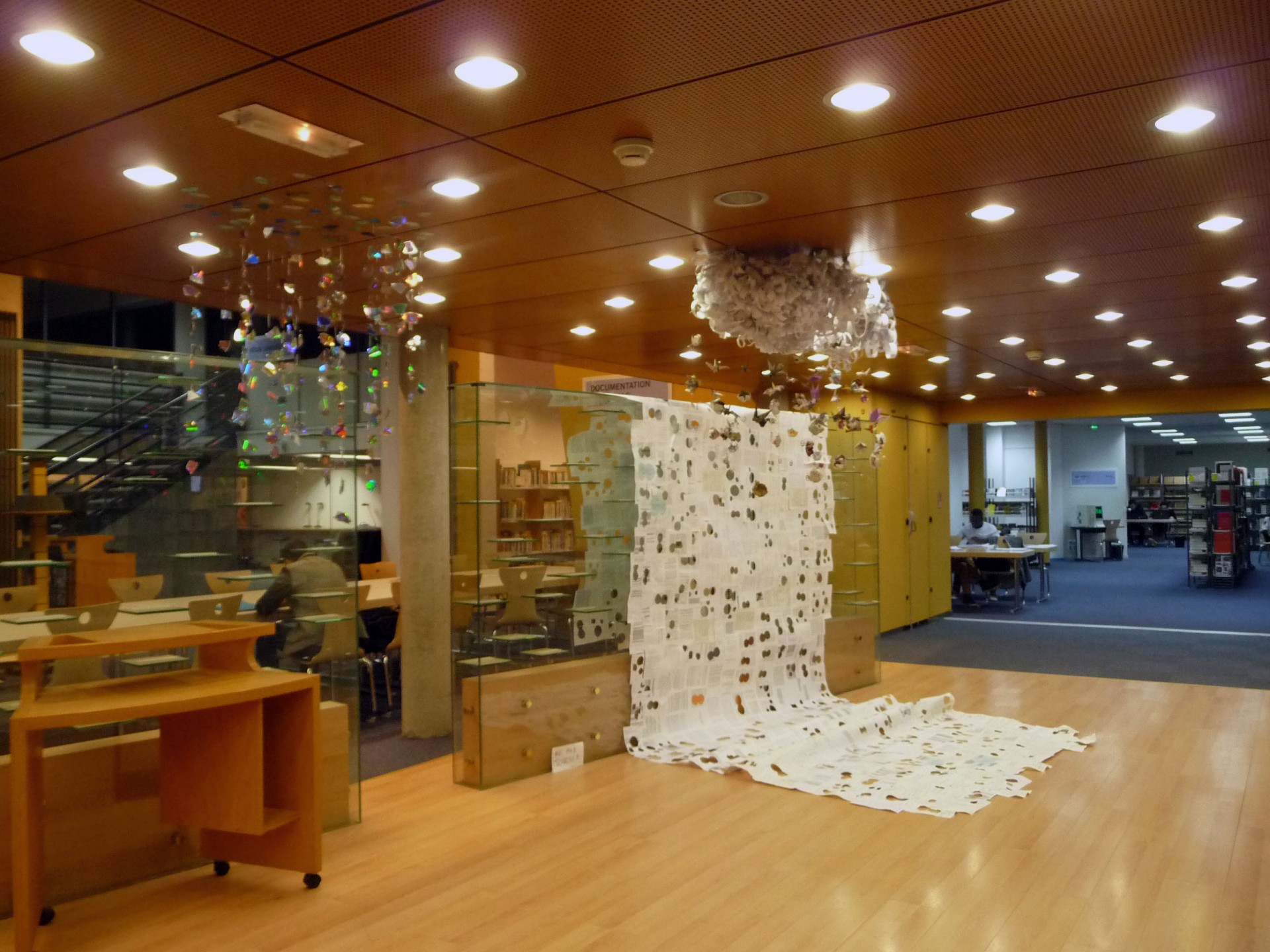 Les étudiants en L2 Arts plastiques de Metz présentent à la BU des installations artistiques en rapport avec l'oeuvre protocolaire de Yona Friedman, Prototype improvisé de type "nuage", proposé par le FRAC Lorraine.