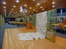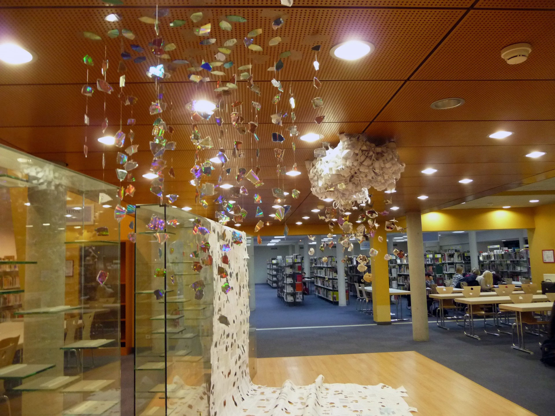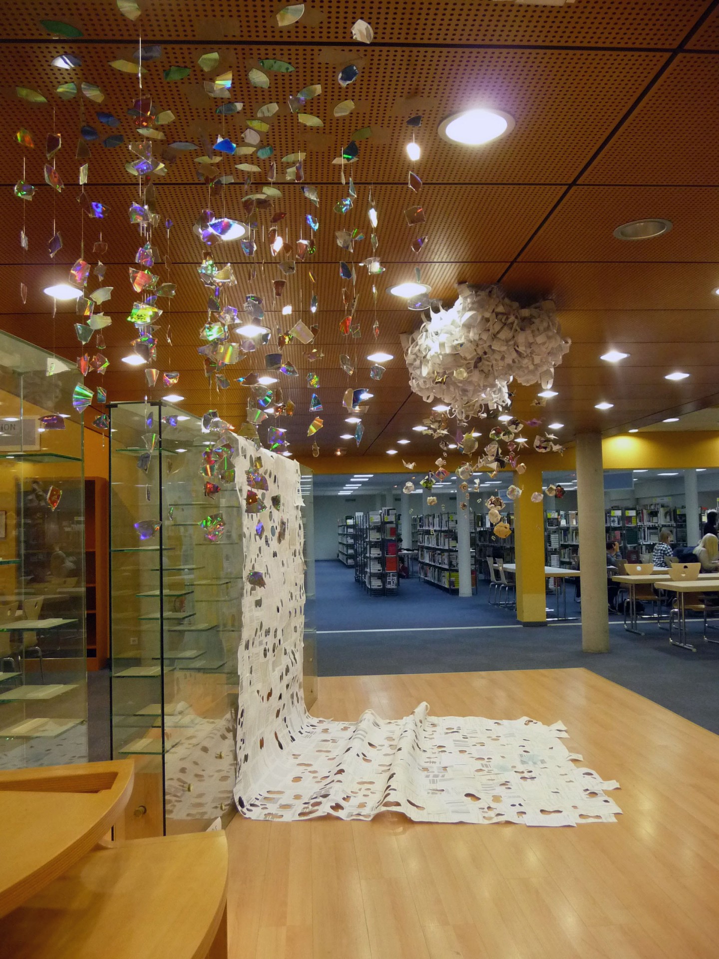 Un nuage ou un brouillard n'est pas qu'opaque, ce qui explique l’utilisation de feuilles de papier parsemées de motifs H2O, formule moléculaire d'hydrogène et d’oxygène compose ce que l'on appelle nuage. Il n'est donc pas anodin que la nappe de papier soit issue de manuels scientifiques dans le but de souligner sa forme logique, de ce que nous pourrions qualifier de magique. Oeuvres visibles à la BU jusqu'à début décembre.