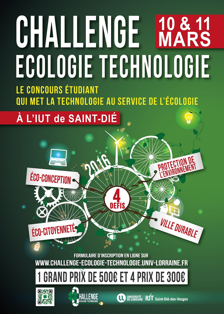Vous retrouverez toutes les informations nécessaires, à diffuser largement aux étudiants sur : http://challenge-ecologie-technologie.univ-lorraine.fr. Les inscriptions au challenge sont ouvertes jusqu’au 26 février 2016 !