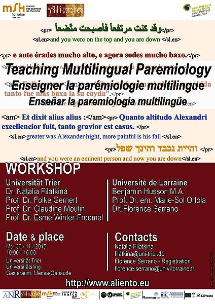 Dans le cadre du projet « Analyse multilingue des proverbes » financé par le projet ANR Aliento et l'Université de la Grande Région, l'atelier « Enseigner la parémiologie multilingue » aura pour objet l'enseignement des langues étrangères via la parémiologie et la traduction.