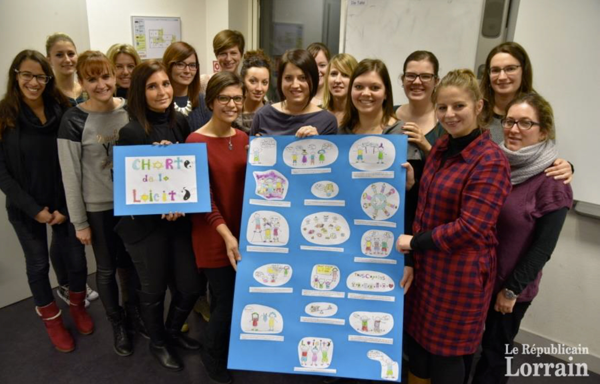 Partant d'un constat de compréhension peu aisée de la charte de la laïcité pour des élèves de primaire, les étudiants et professeurs stagiaires se sont attelés à un travail de réécriture de celle-ci. En raison de l’aspect institutionnel de la charte et de la dimension biculturelle du site de l'ESPÉ de Sarreguemines, ce travail de réécriture s’est effectué en français, mais aussi en allemand. Les étudiants de l’ESPE se sont attachés ensuite à donner à la charte une forme visuelle originale et attractive pour des enfants des cycles 2 et 3, grâce à un travail plastique. A l’issue de la journée, les étudiants ont présenté leurs productions et explicité leurs choix devant l’ensemble des formateurs.