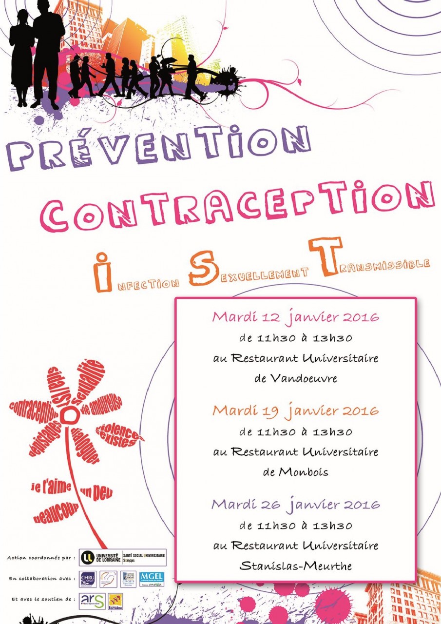 Cette campagne "Prévention Contraception IST" se déroulera dans les restaurants universitaires de Vandœuvre (le 12/01/16), de Monbois (le 19/01/16) et de Stanislas-Meurthe (le 26/01/16) de 11H30 à 13H30 sous forme d’une animation autour de stands, où l’étudiant pourra s’entretenir auprès de professionnels (médecins, infirmières, assistantes sociales et personnel d’accueil du SUMPPS; ainsi qu’une animatrice de la MGEL) et obtenir des documents pédagogiques et des échantillons « utiles » (préservatifs...). L’équipe d’animateurs professionnels sera accompagnée par des étudiants de 2ème année de Médecine qui animeront leurs propres ateliers dans le cadre de leur module optionnel Prévention.