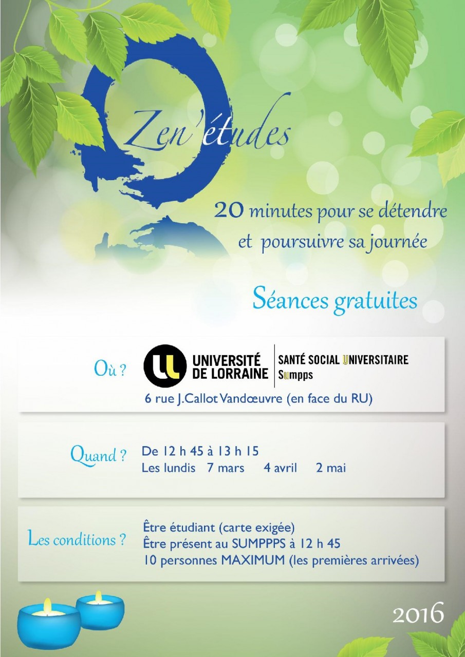 Le Sumpps (Service universitaire de médecine préventive et de promotion de la santé) vous propose sur son site de Vandoeuvre (en face du resto U), une séance de relaxation gratuite par mois.
