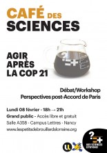 L'association des Petits Débrouillards de Nancy et AXIT (association d'élèves de Sciences Politiques Nancy) organisent un atelier de travail autour des décisions prises lors de la COP21, et des perspectives ouvertes dans les années à venir pour une transition durable.