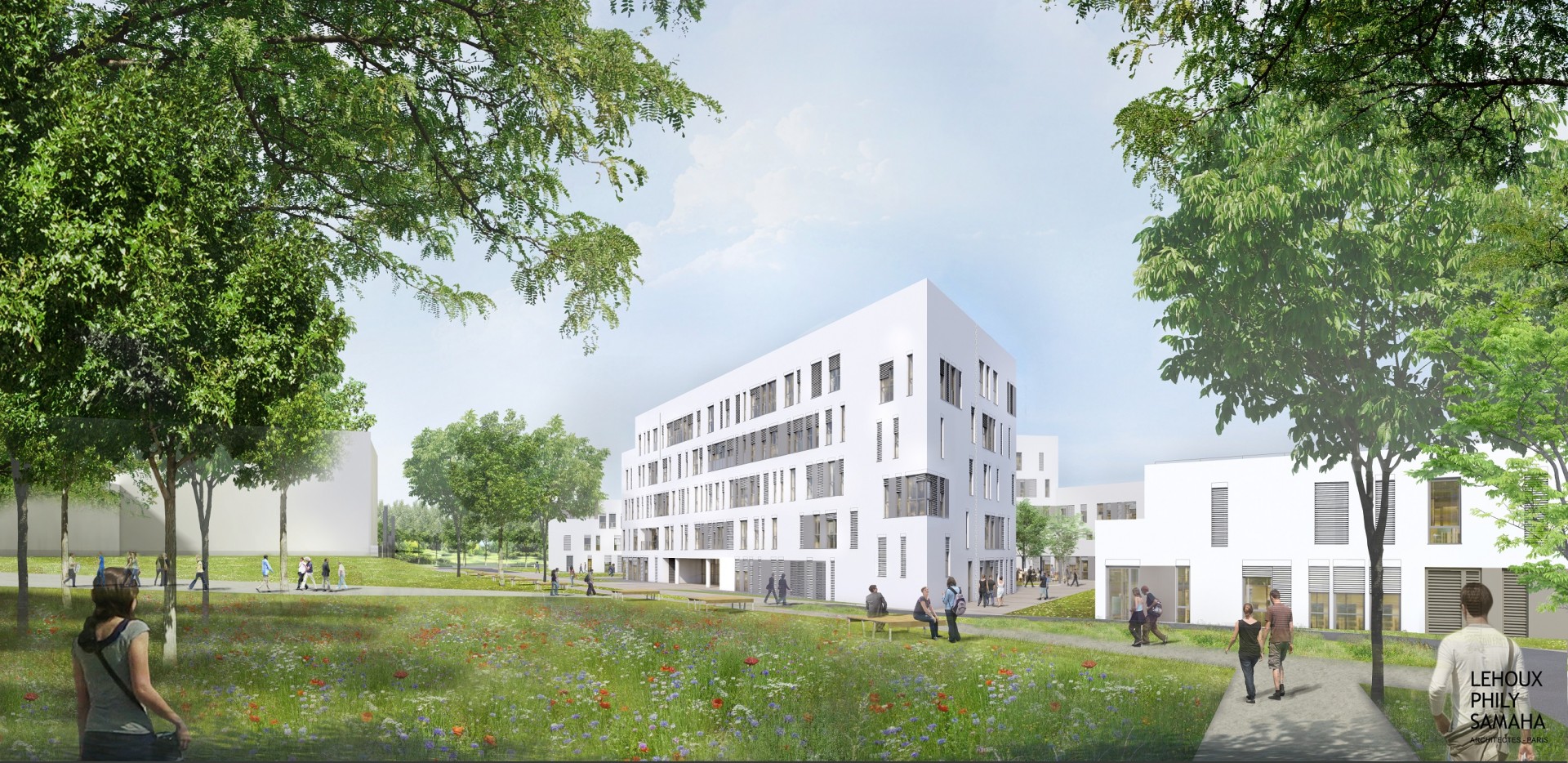 - la construction d’un amphithéâtre de 400 places et de surfaces administratives partagées, le tout regroupé dans un bâtiment principal (8 570 m2) ;